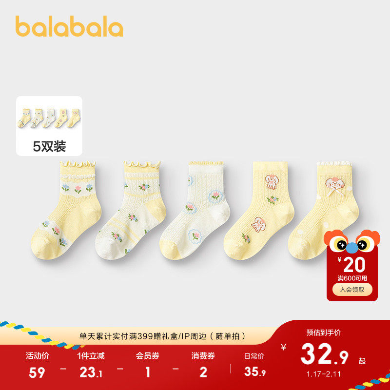巴拉巴拉女童袜子儿童网眼袜夏中幼童甜美提花柔弹亲肤舒适五双装
