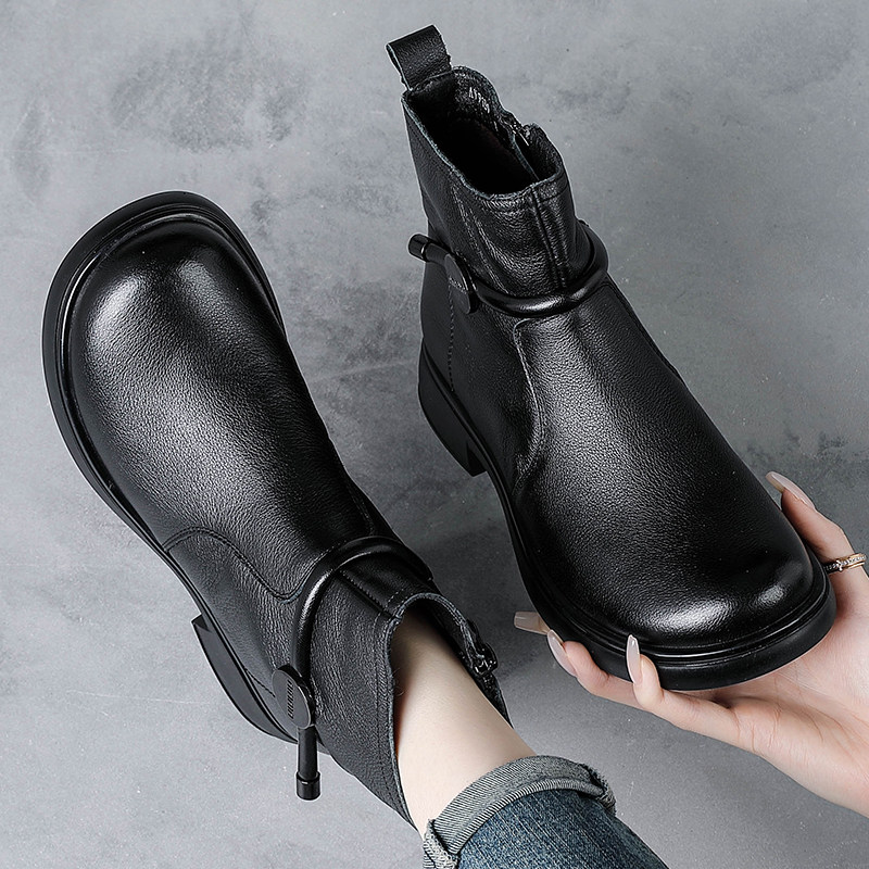 牛皮版~内增高复古短靴女2025秋冬西部马丁靴圆头短筒勃肯堆堆靴