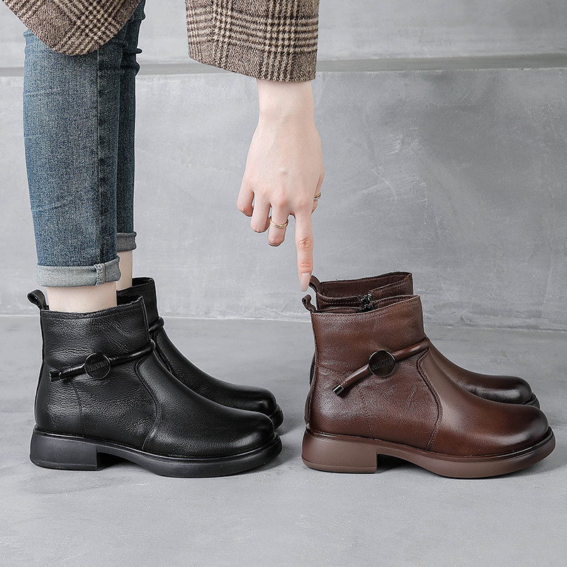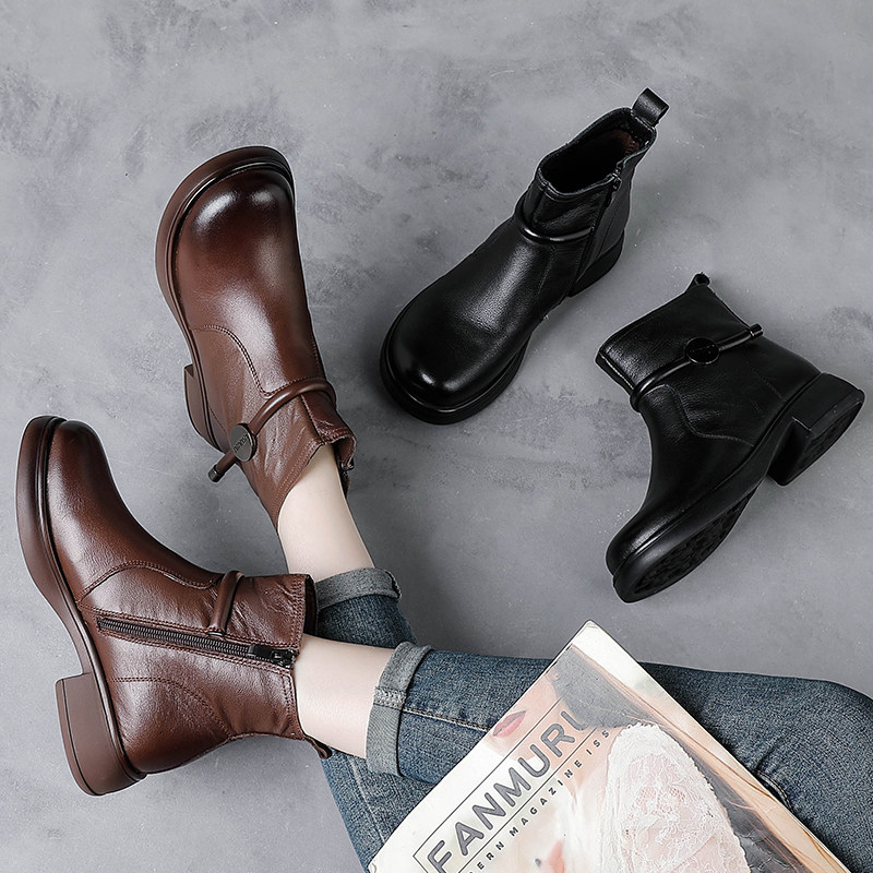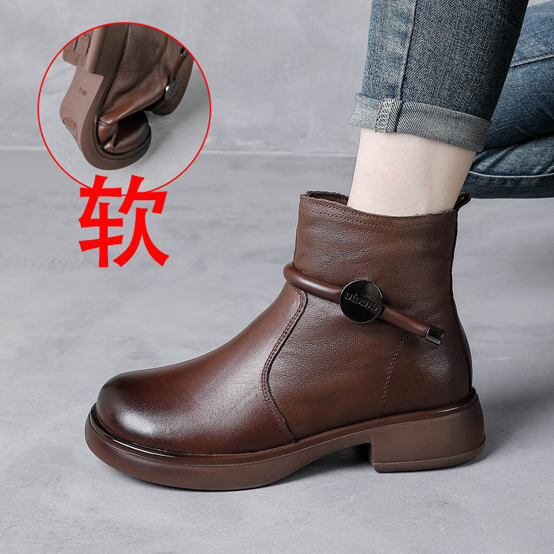 他她女孩头层牛皮秋冬2025新款单靴子女中年妈妈皮鞋加绒真皮防水