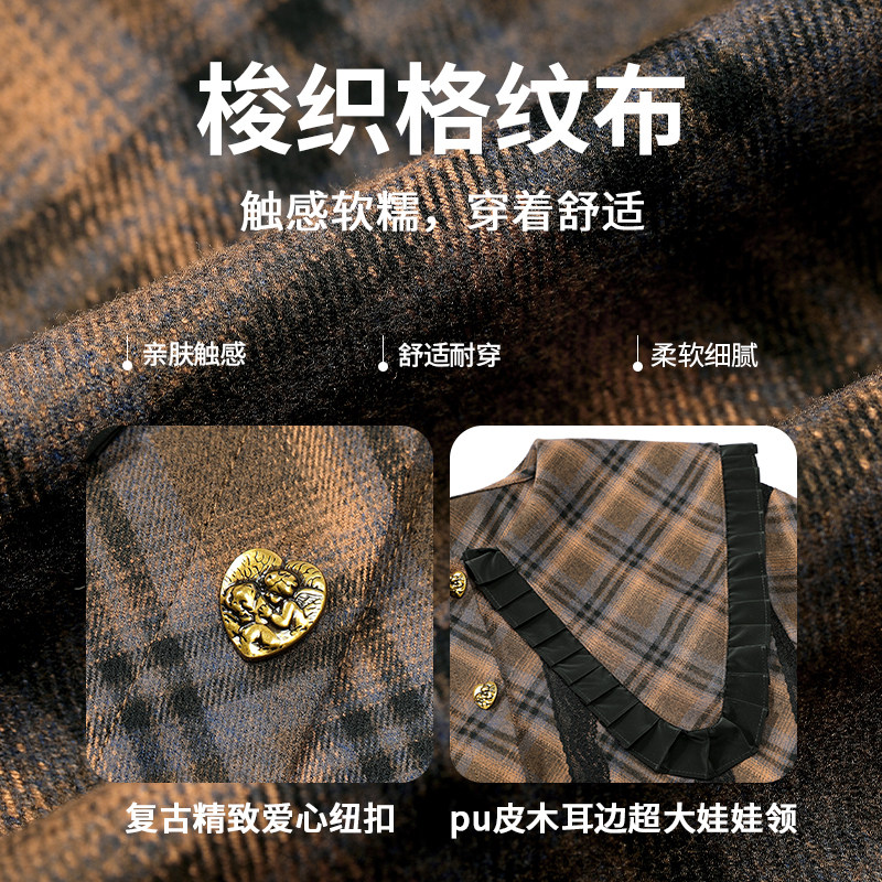 妖精的口袋PU皮拼接娃娃领连衣裙女2025年冬季新款学院风甜美裙子