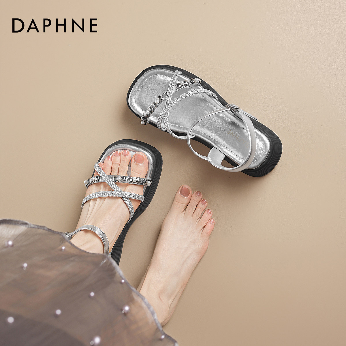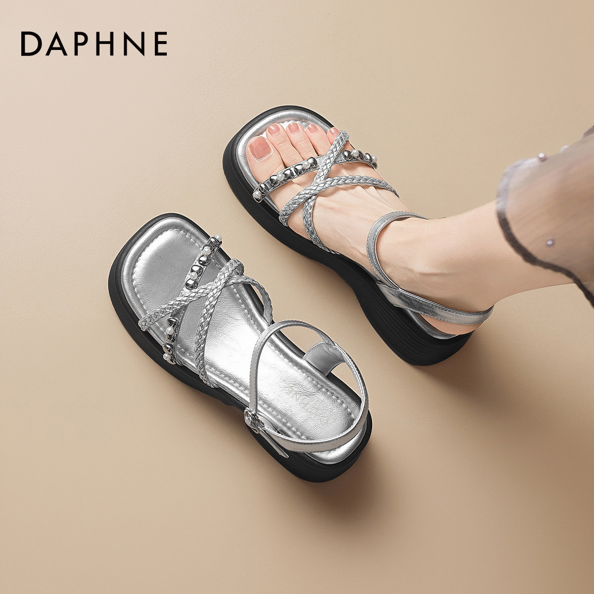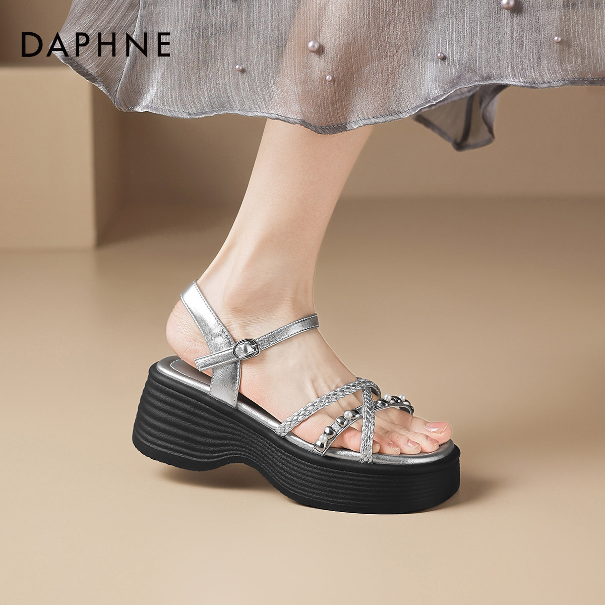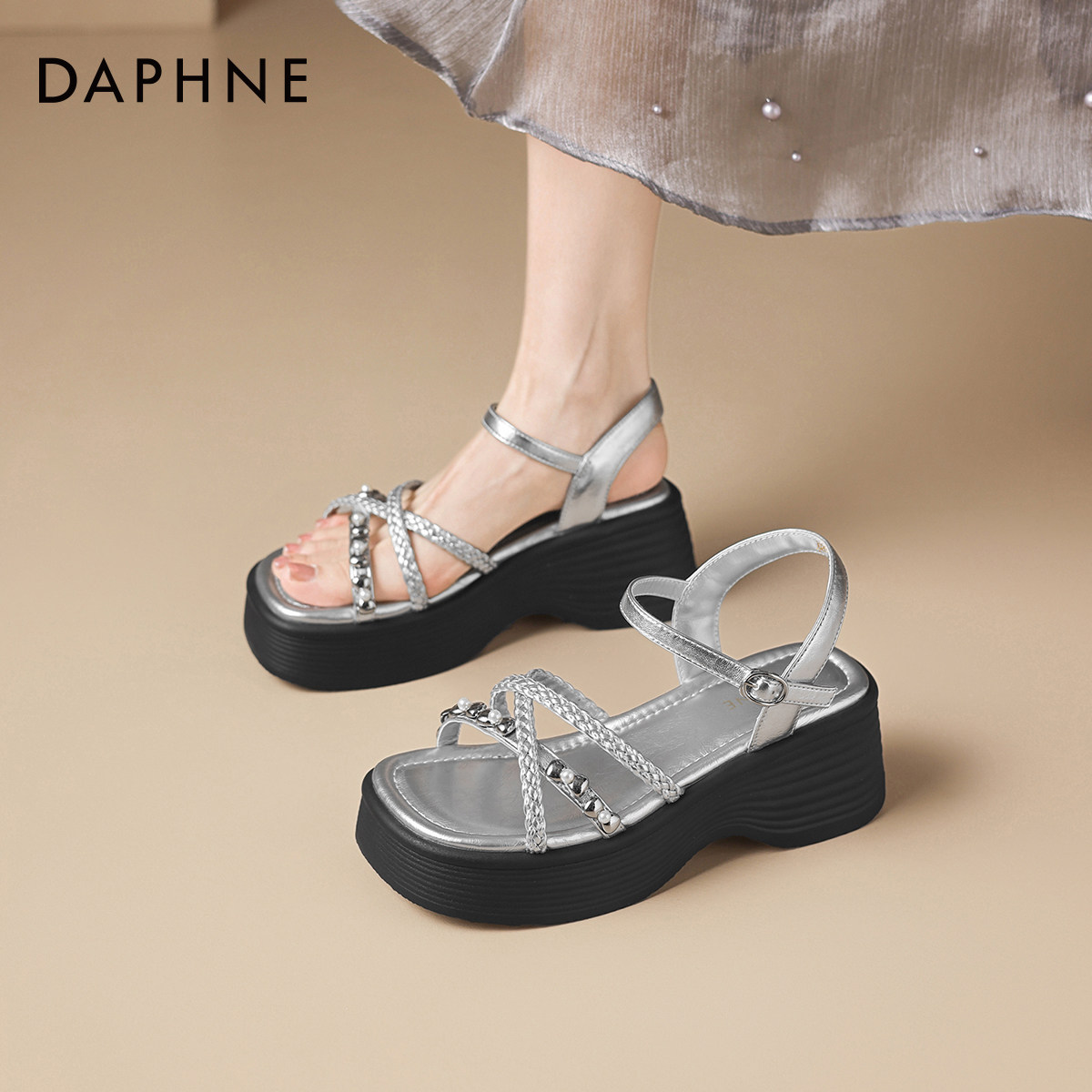 达芙妮厚底凉鞋女款2026新款夏季平底银色坡跟增高外穿法式罗马鞋