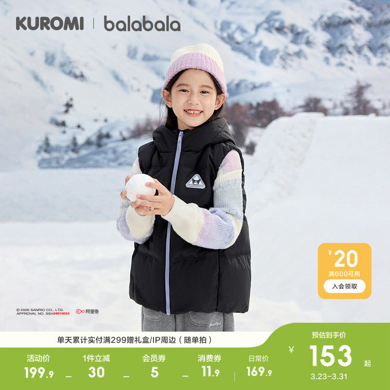 【库洛米IP】巴拉巴拉女童背心羽绒马甲秋冬童装儿童连帽三丽鸥萌