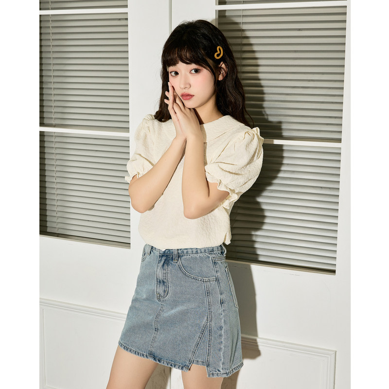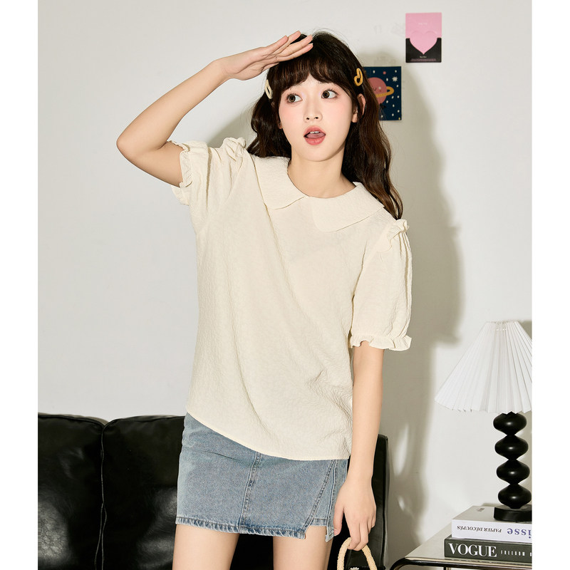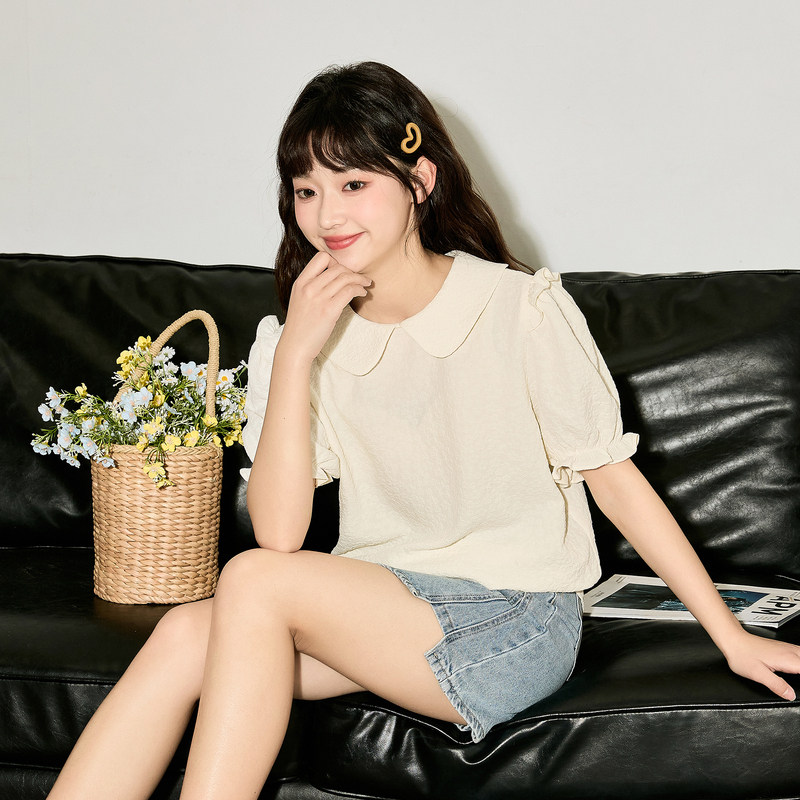 唐狮春夏新款短袖衬衫女娃娃领泡泡袖肌理感衬衣甜美小个子