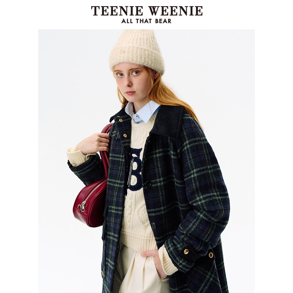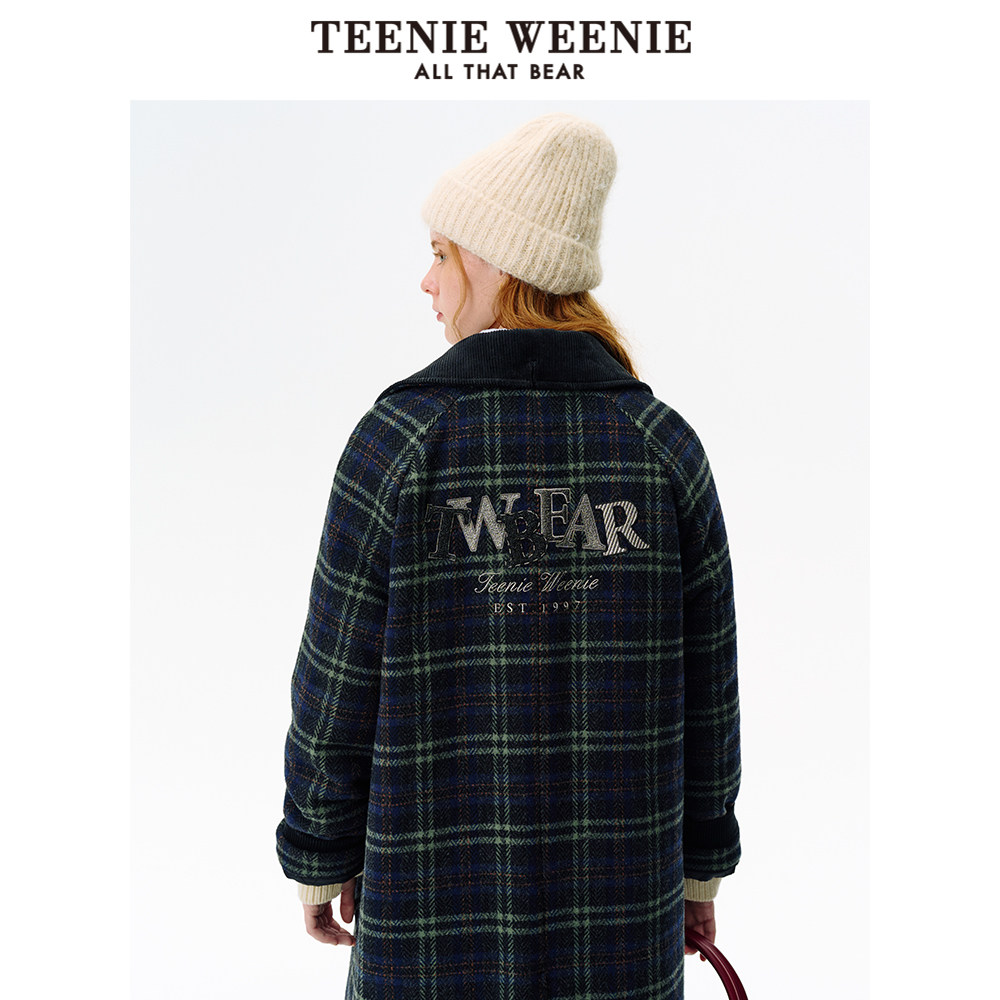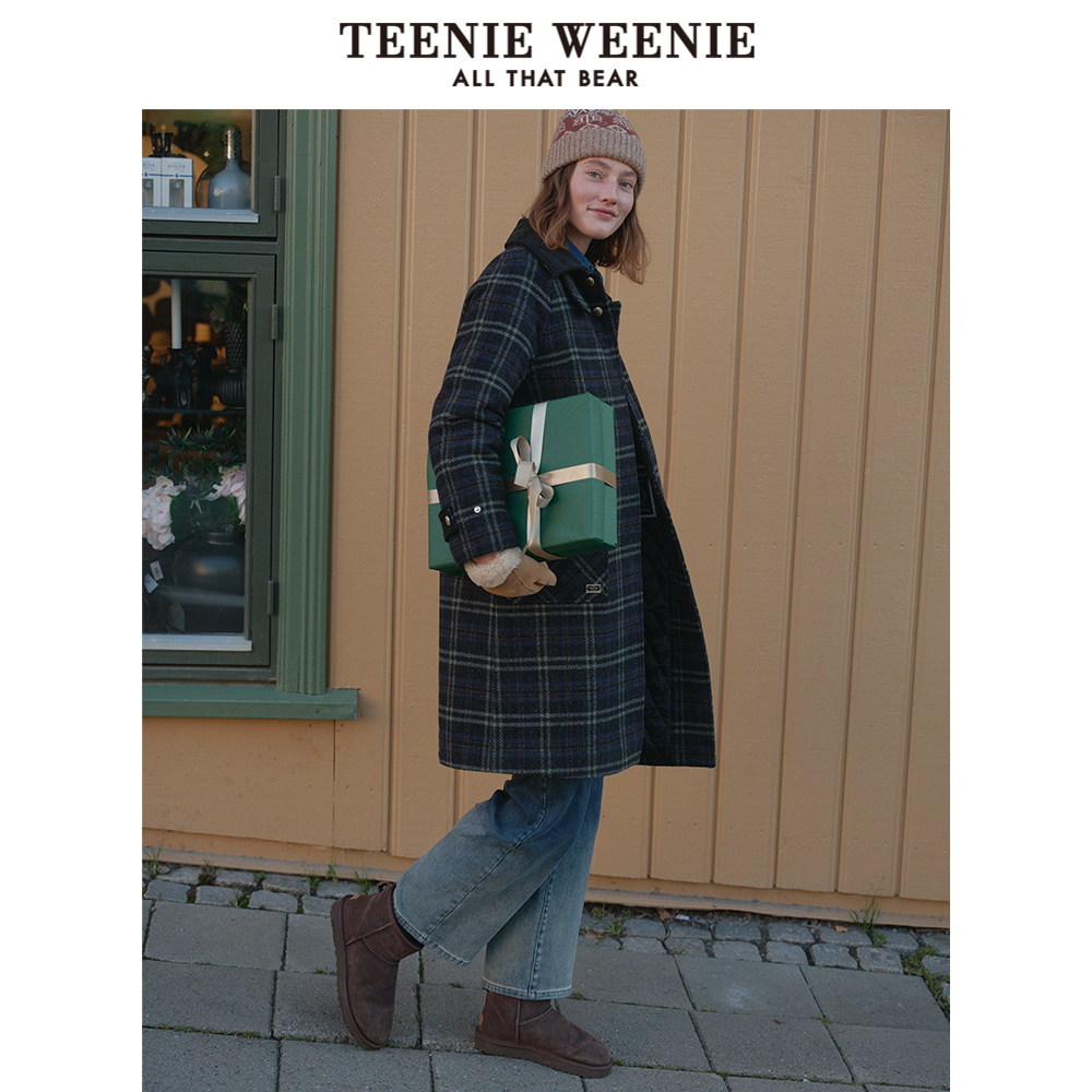 TeenieWeenie小熊奥莱格纹毛呢大衣女冬季长款夹棉直筒外套