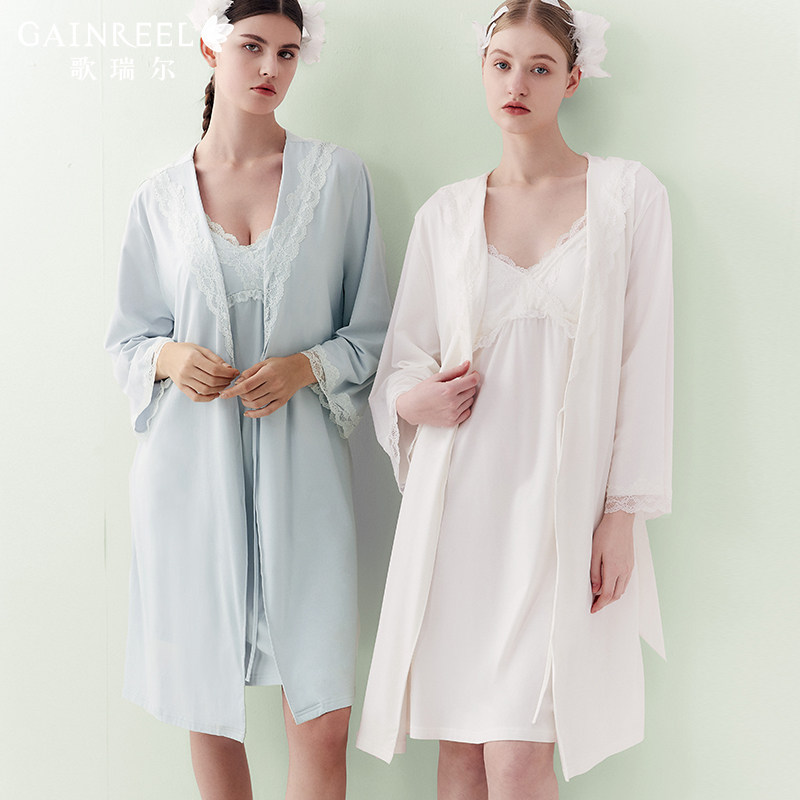 歌瑞尔性感晨袍亲肤柔软莫代尔棉睡袍可外穿绑带外袍浴袍纯欲蕾丝