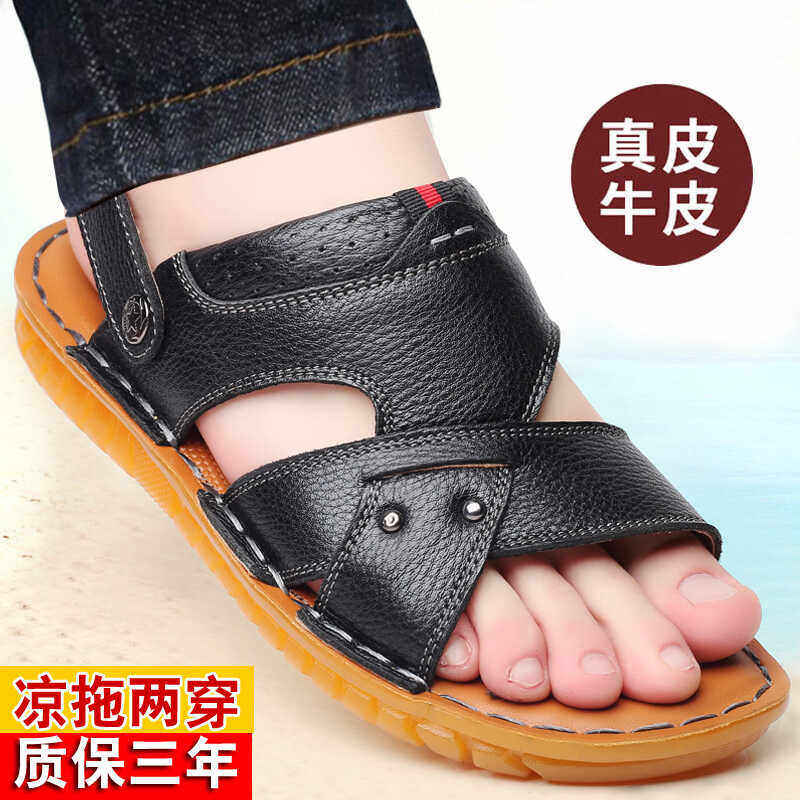 老人头凉鞋男2026夏季牛皮休闲外穿沙滩鞋真皮防滑中老年爸爸拖鞋