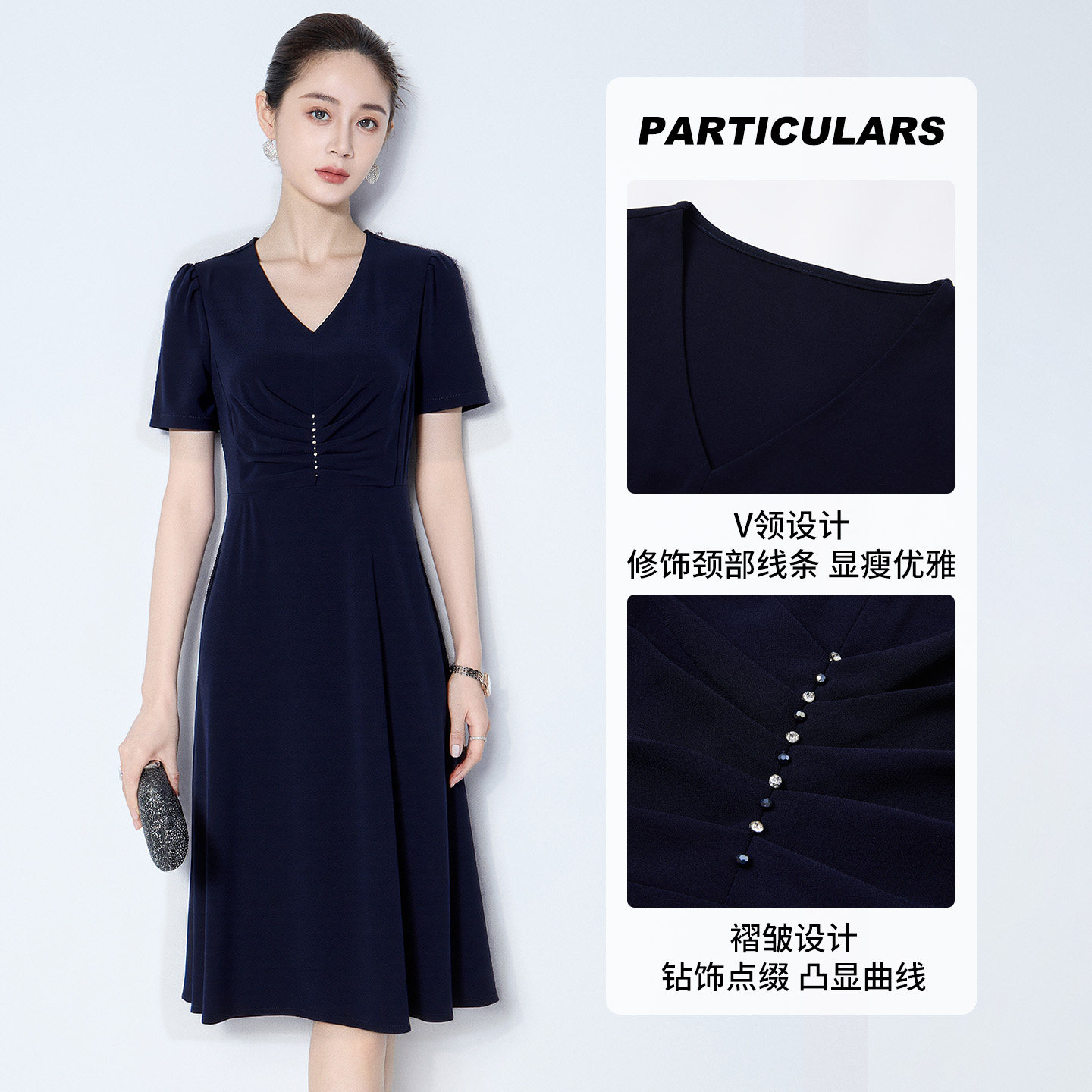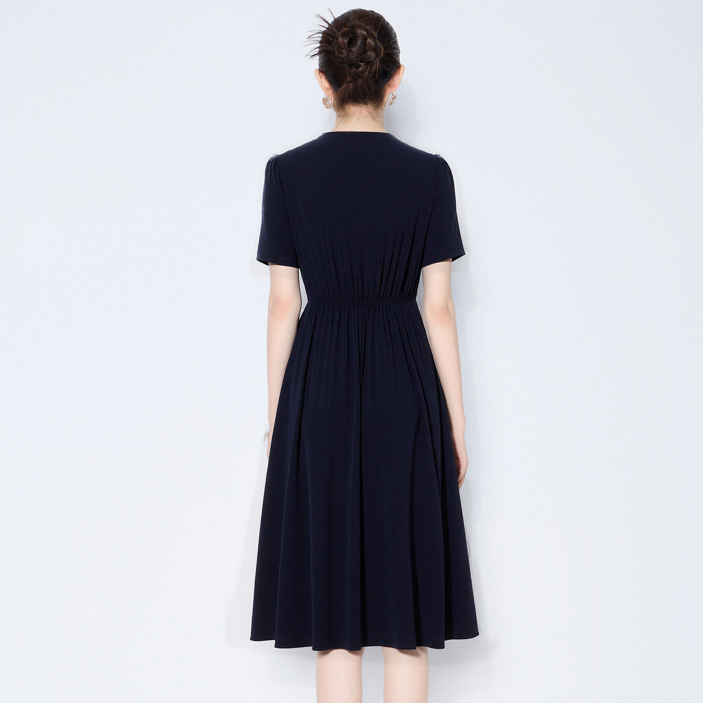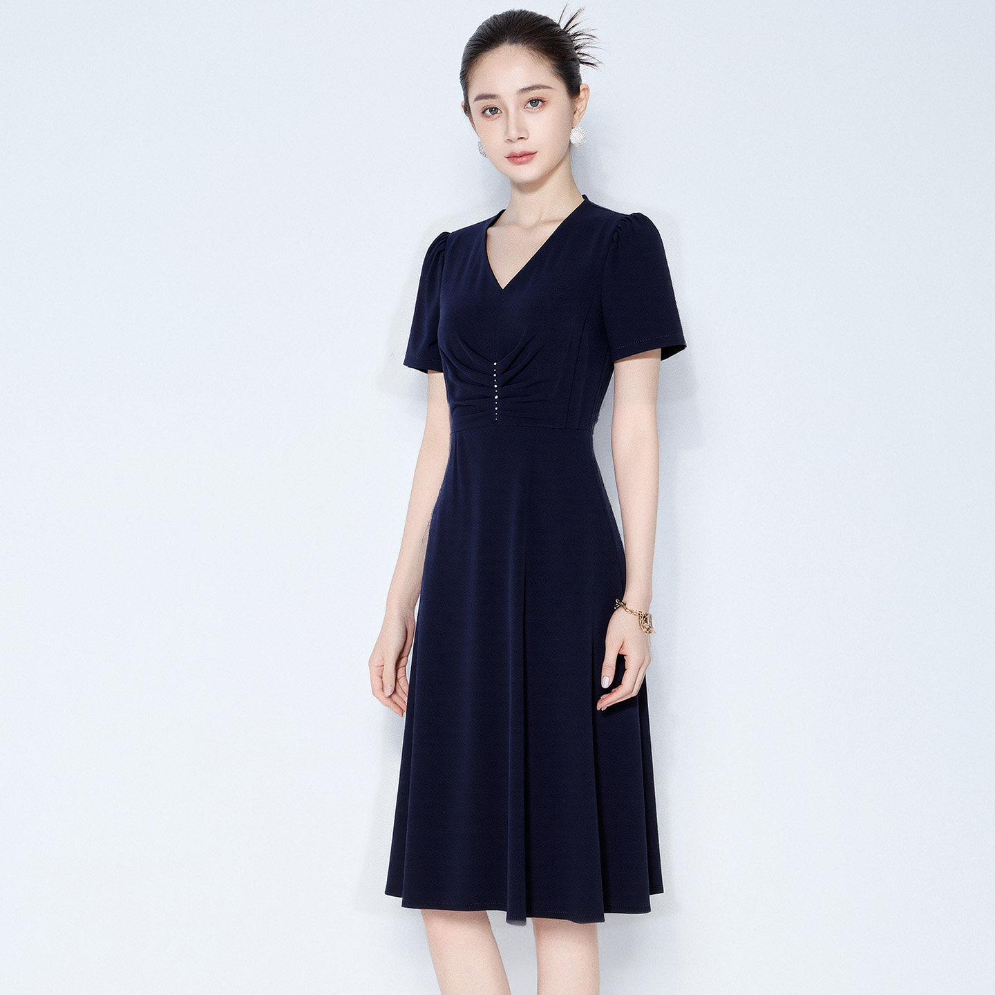 马天奴2025夏季新款藏青色V领捏褶收腰连衣裙子短袖时尚气质女装