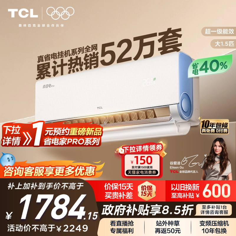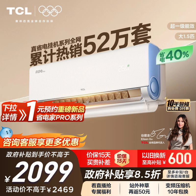 TCL 大1.5匹小蓝翼真省电Pro空调挂机超一级能效省电40%变频空调
