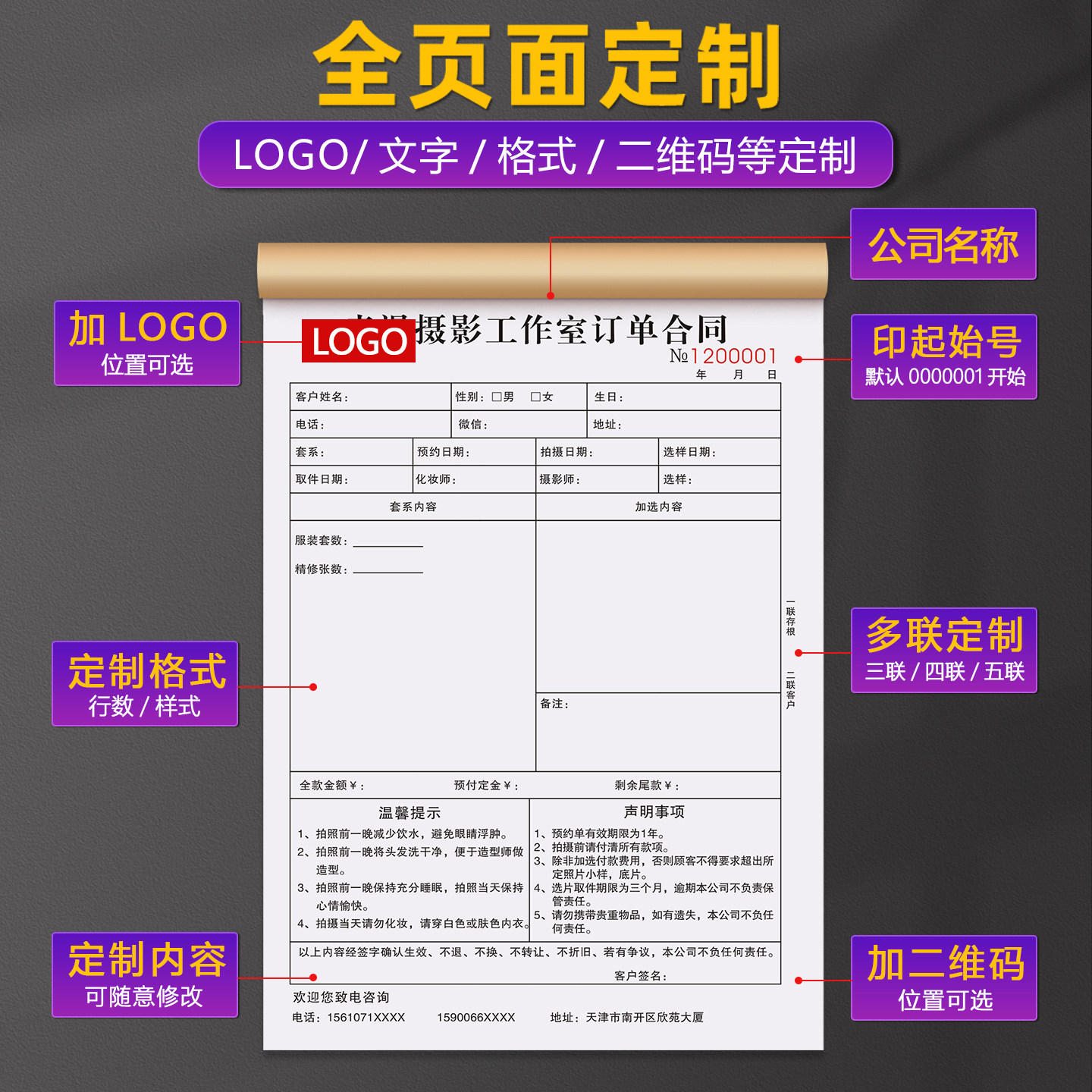 【摄影工作室订单合同】定制二联商业广告拍摄预定流程单写真馆拍照预约服务单服装租赁取件押金单据化妆票据
