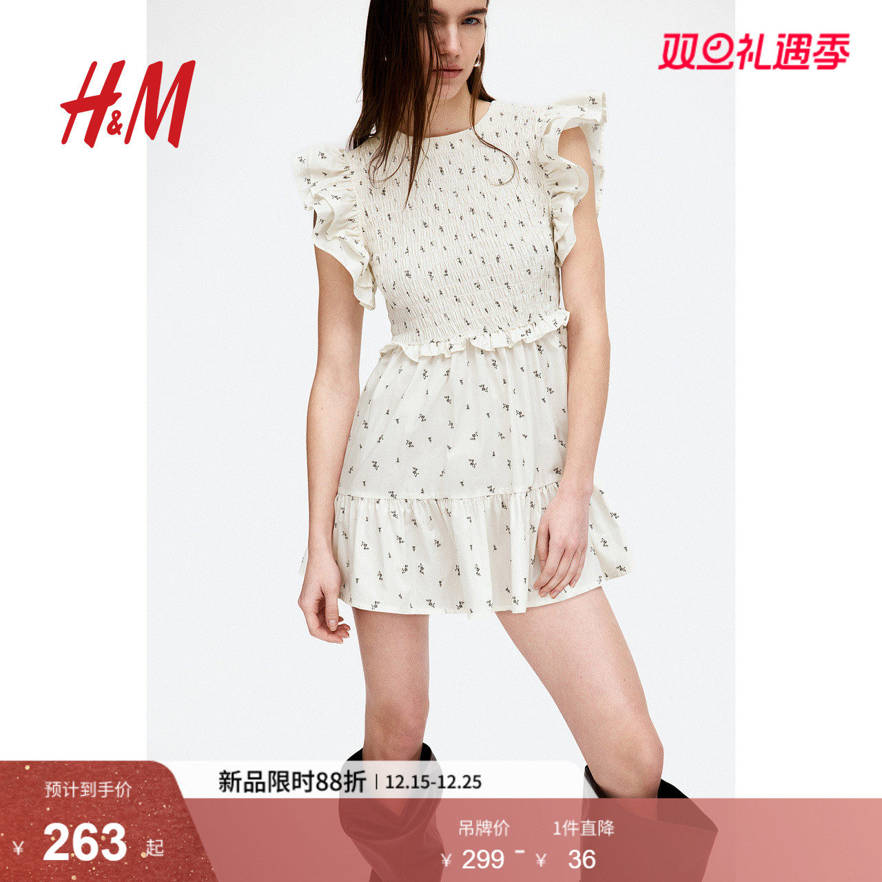 HM女装连衣裙2025冬季新款圆领飞袖府绸设计感碎花连衣裙1270323