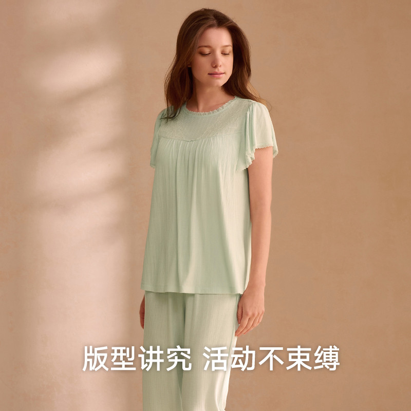 茶歇|曼妮芬带杯垫女士舒适家居服短袖长裤蕾丝莫代尔睡衣套装