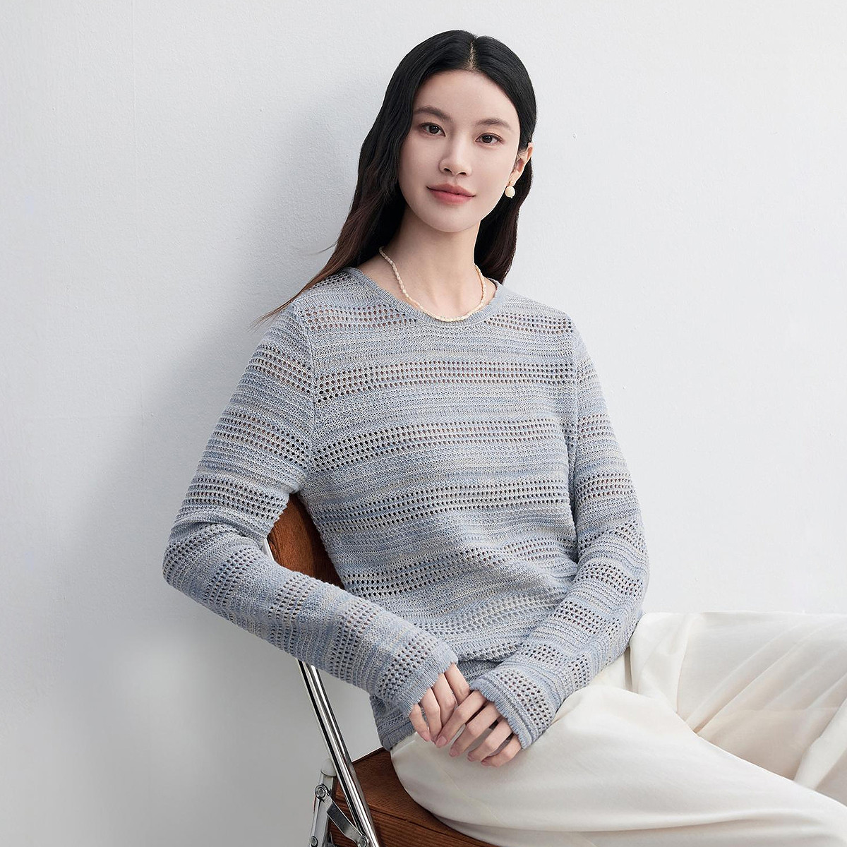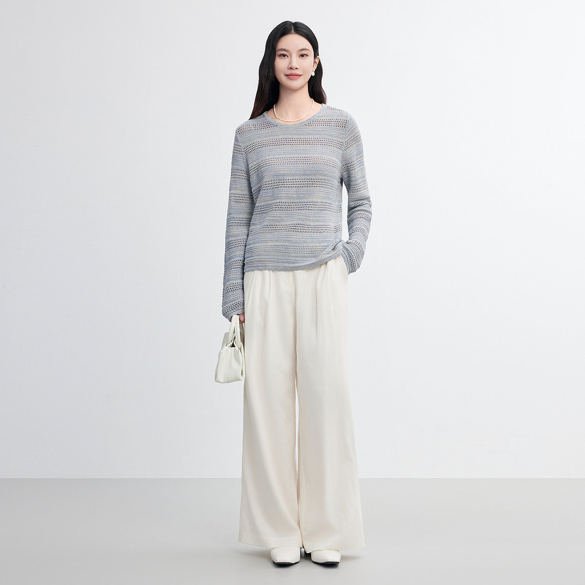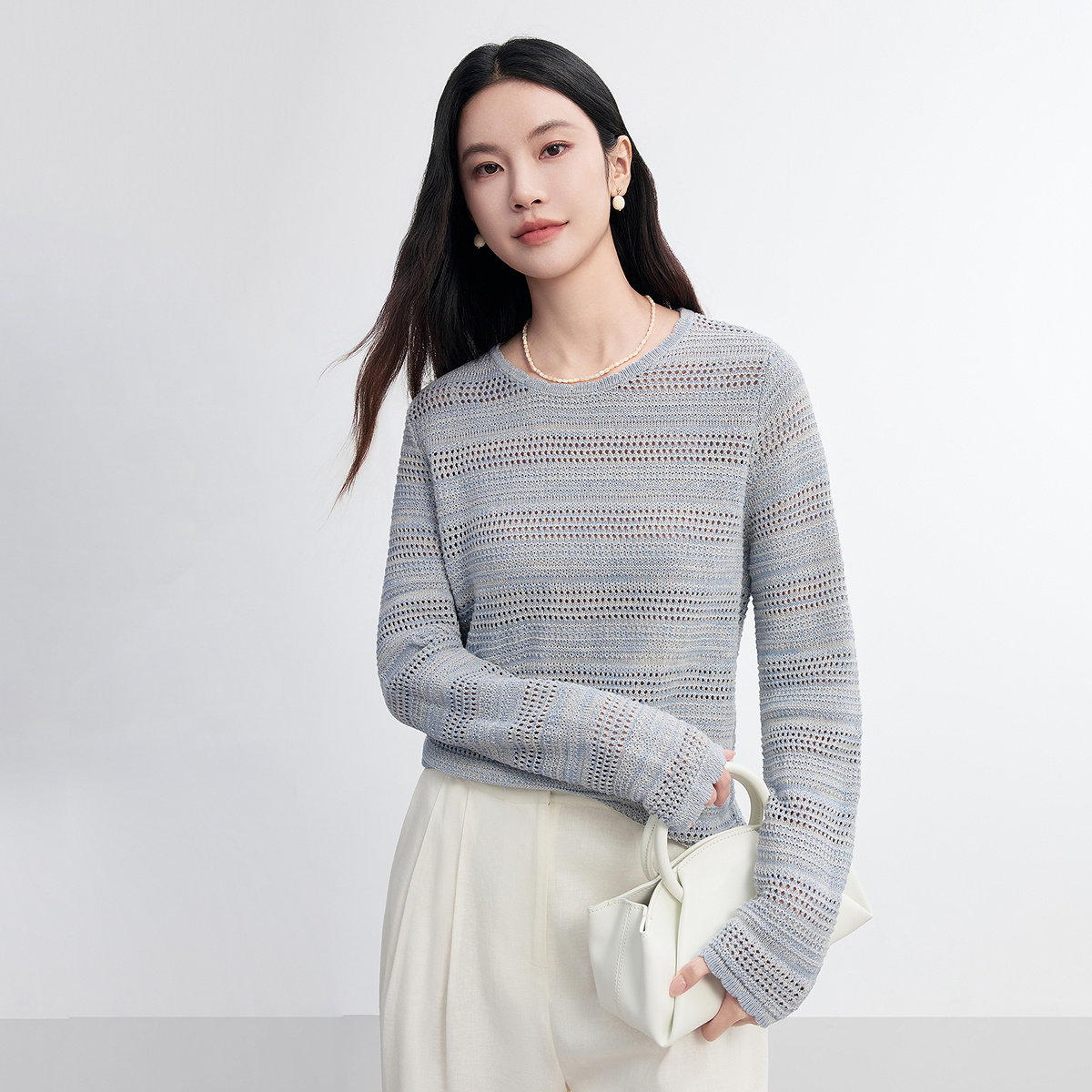 FINITY菲妮迪针织衫2026春新款简约灰色镂空亚麻休闲风显瘦上衣女