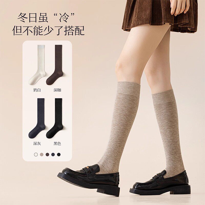 羊毛小腿袜子长筒袜女款秋冬显瘦秋天加厚保暖高筒袜黑色羊绒白色
