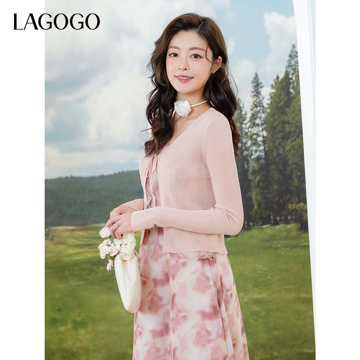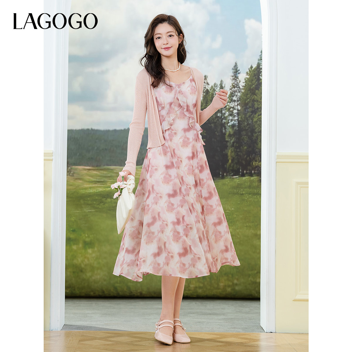 LAGOGO仙气雪纺印花连衣裙女拉谷谷2025年夏季新款开衫裙子两件套