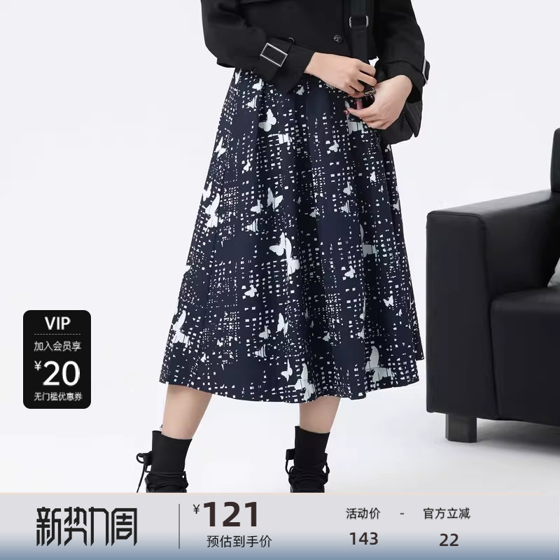 sdeer圣迪奥女装秋文艺休闲撞色印花百褶A字伞裙S24181109