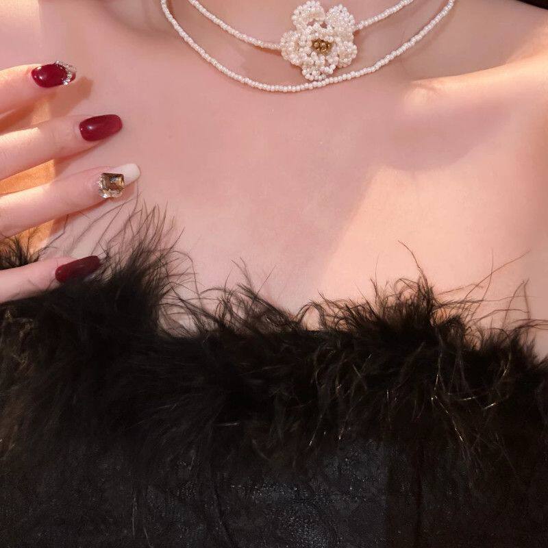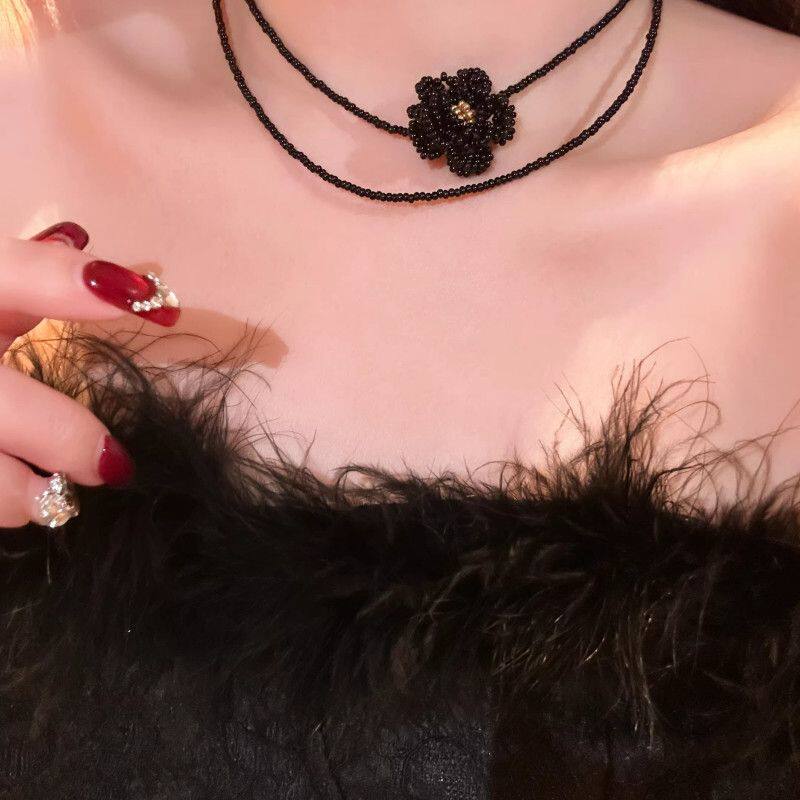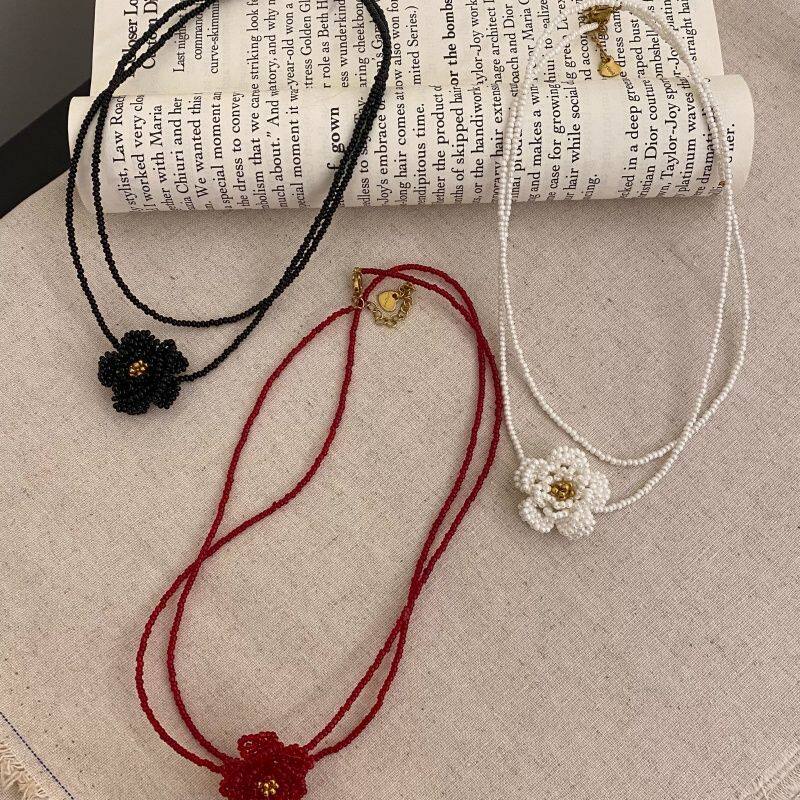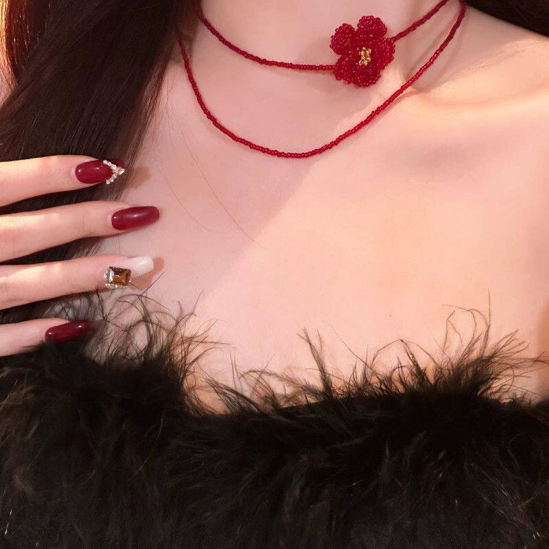 ins风红色山茶花串珠项链女款复古高级感显白锁骨链气质双层颈链