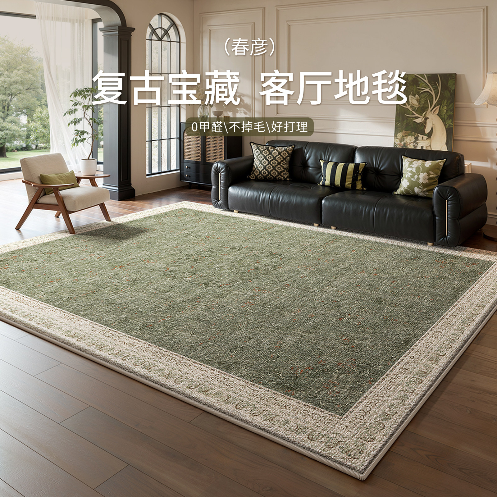 地毯客厅2025新款绿色复古中古风地垫免打理