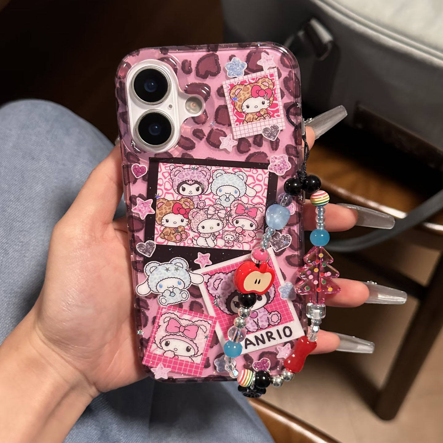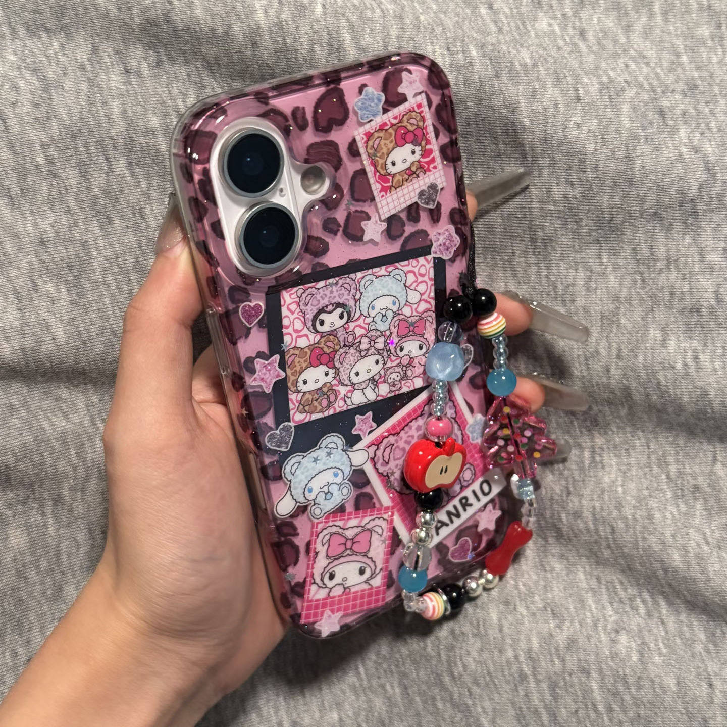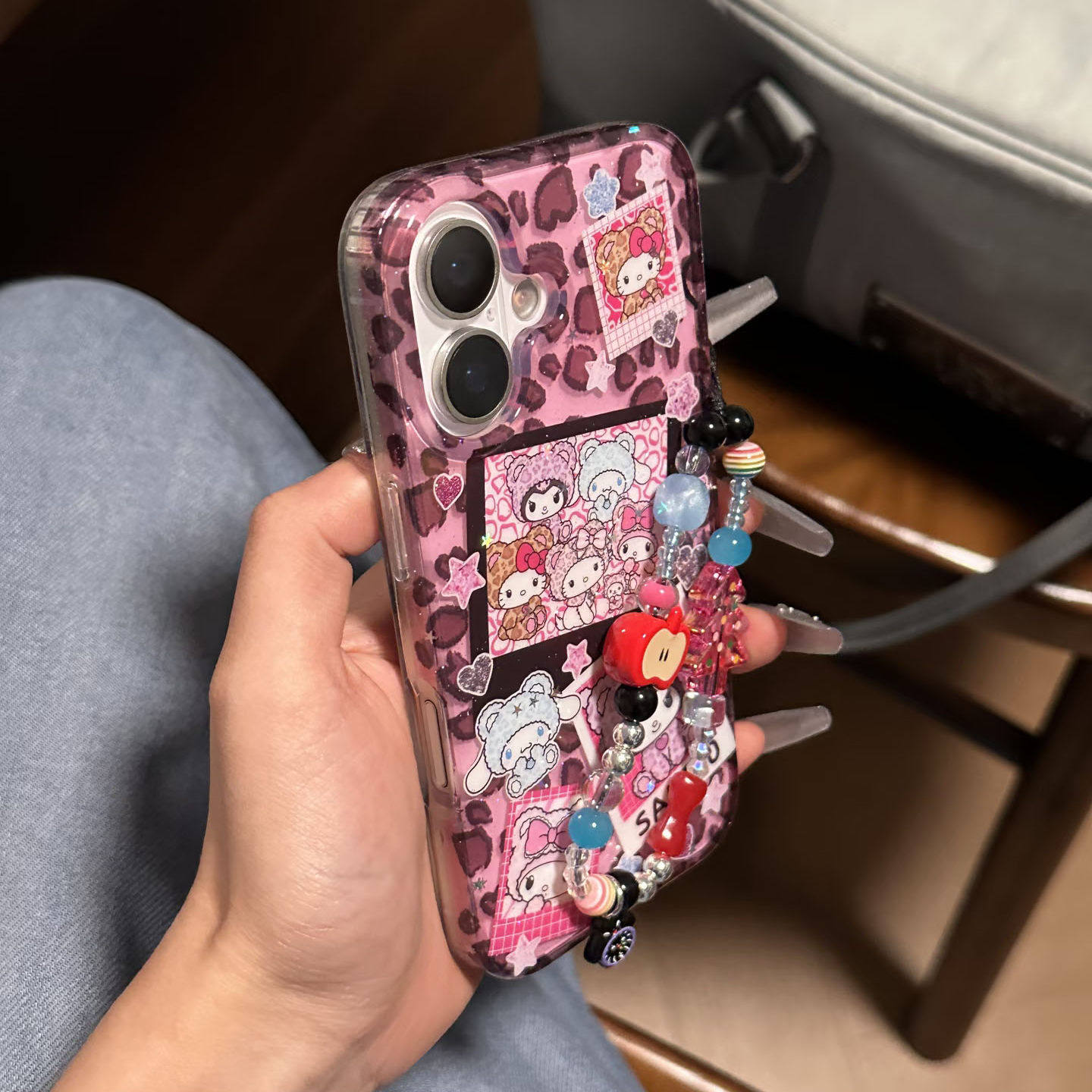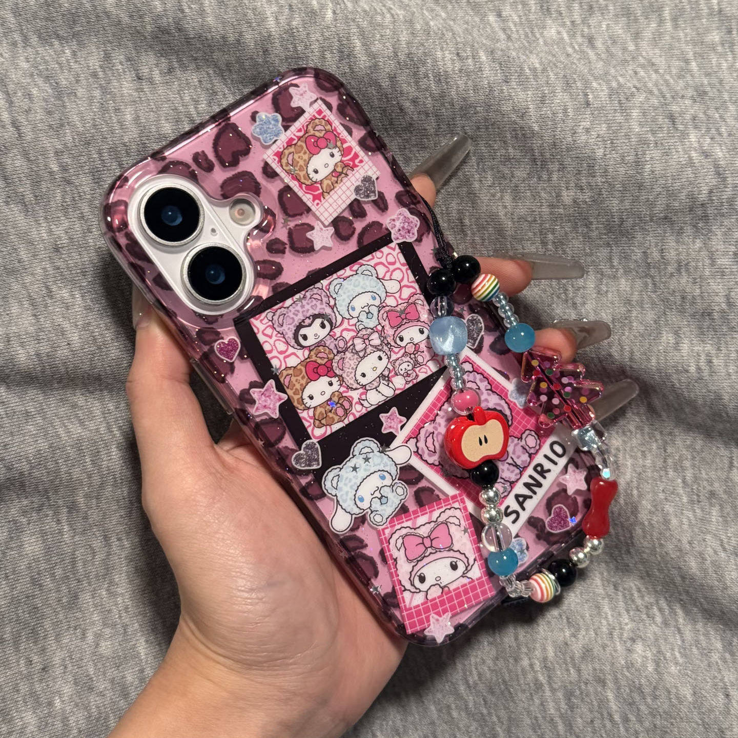 ins可爱豹纹三丽欧库洛米链条手机壳适用苹果16promax新款双层15pro全包14promax保护套14/13防摔16女款