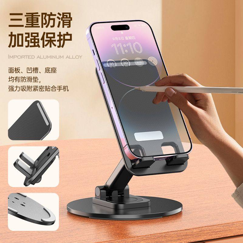 桌面手机支架铝合金圆盘底座360度旋转棘轮音可伸缩折叠平板通用