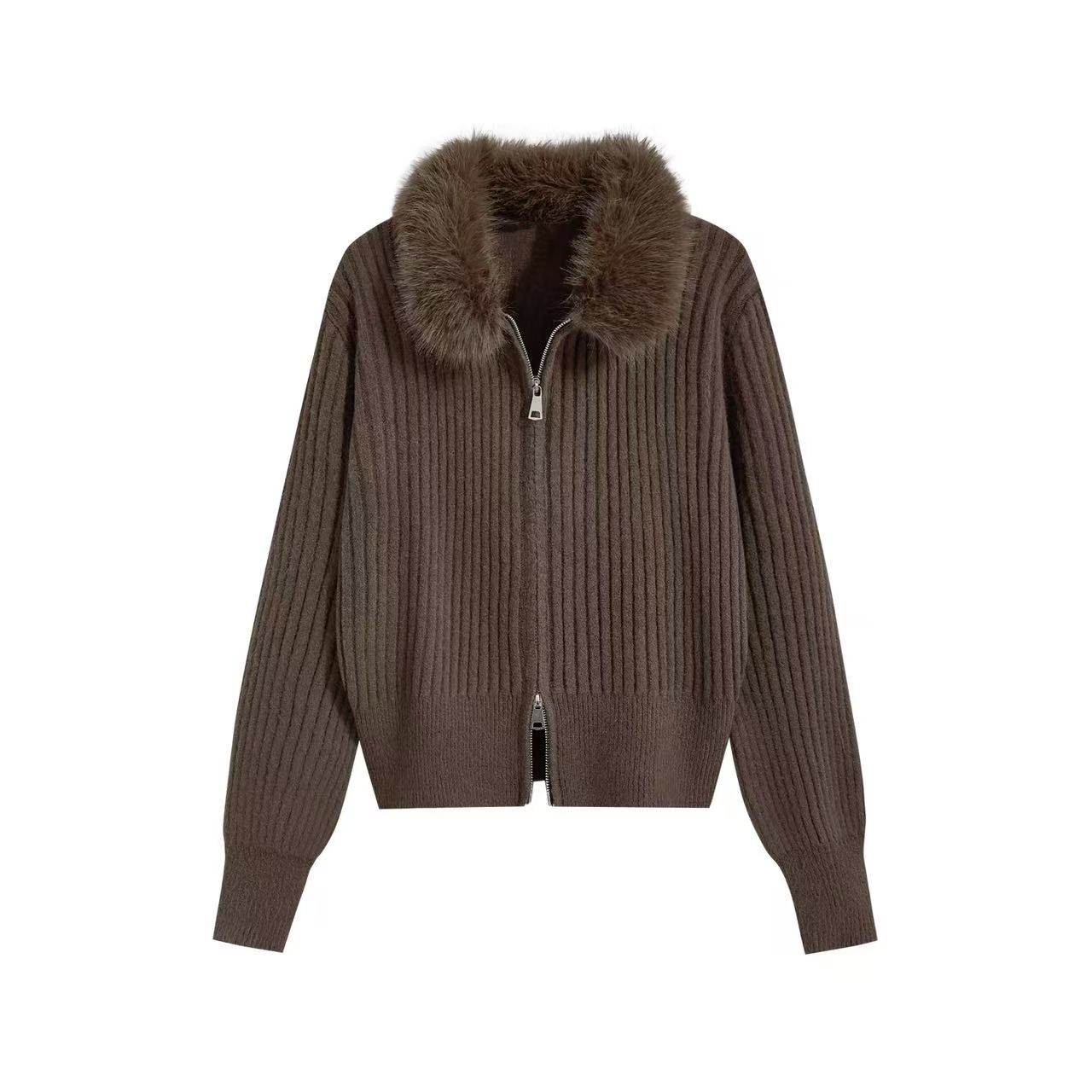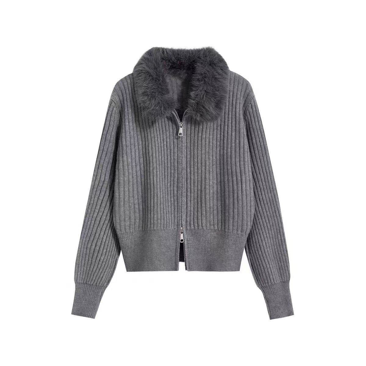 【蜜蜂欢乐社】二茵ERYIN秋冬新款毛领拉链长袖短款针织开衫