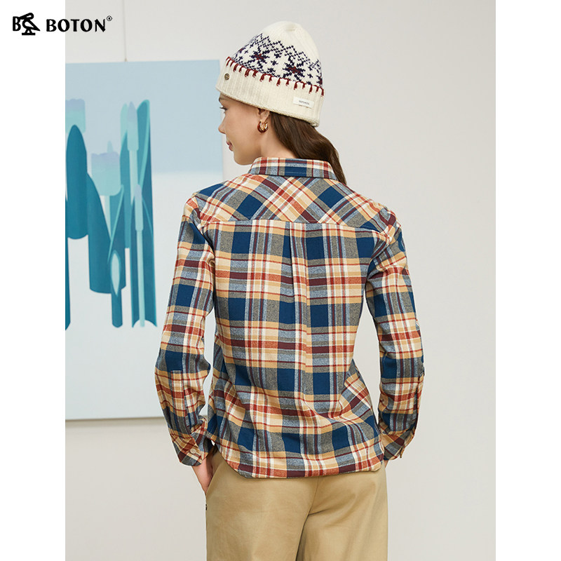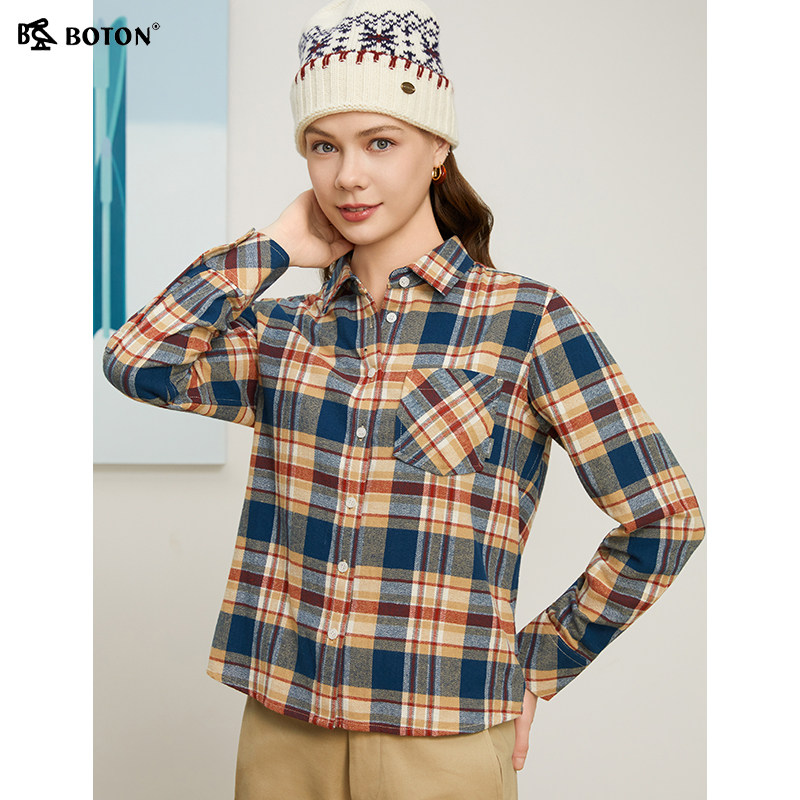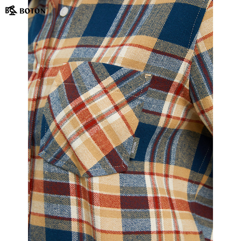 波顿秋冬新款翻领长袖磨毛格子全棉衬衫修身衬衣通勤休闲百搭舒适