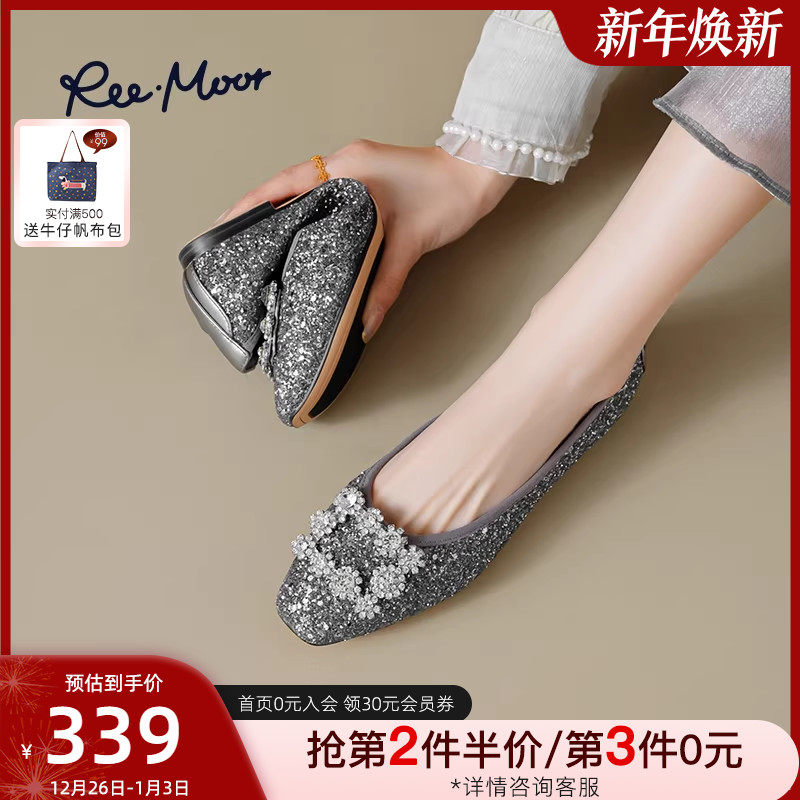 REEMOOR睿慕2025秋季新款水钻方扣单鞋女平底鞋浅口圆头豆豆鞋女