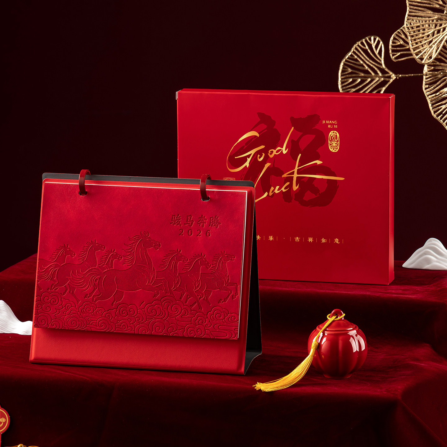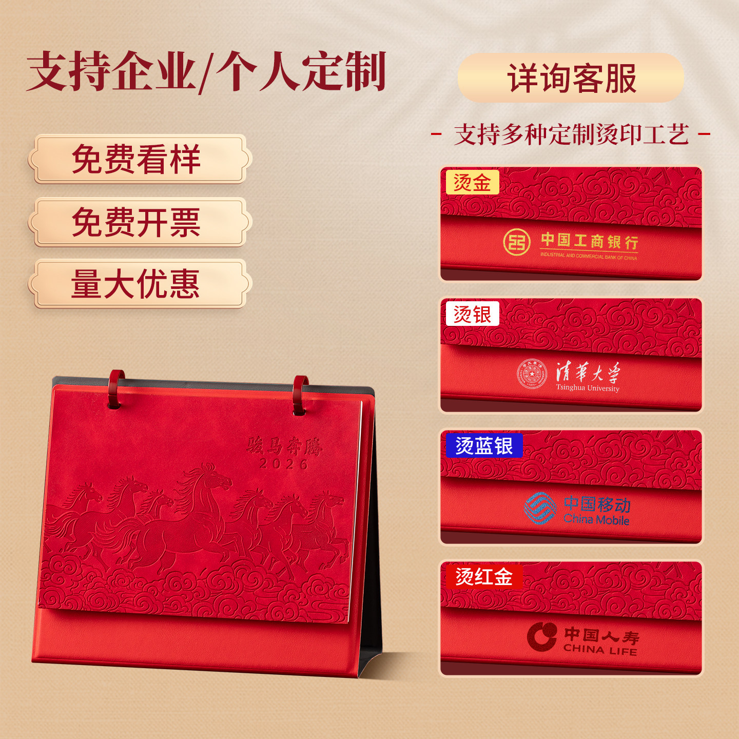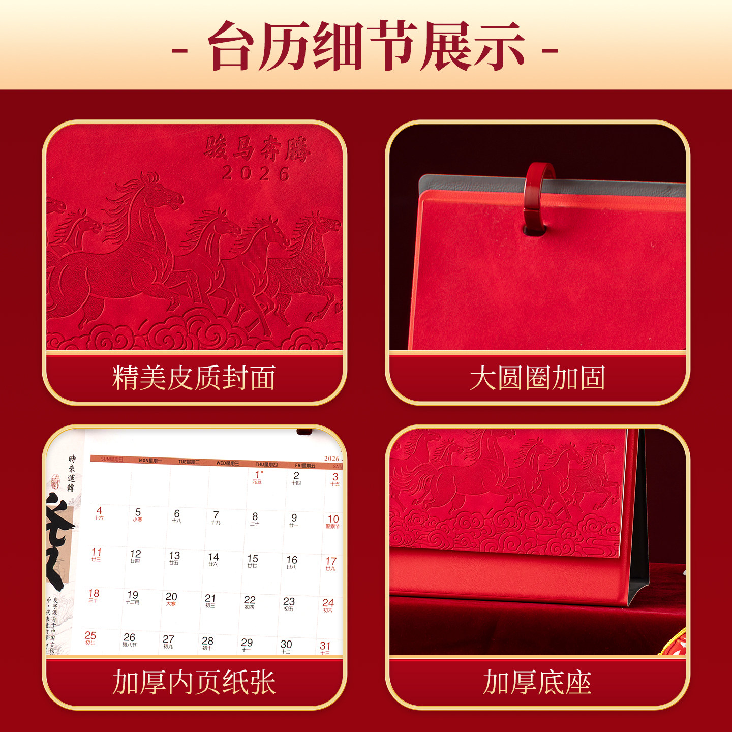 2026年新款台历骏马奔腾公司办公桌面摆件中国风红色马年创意日历办公台历桌面日历企业高档定制