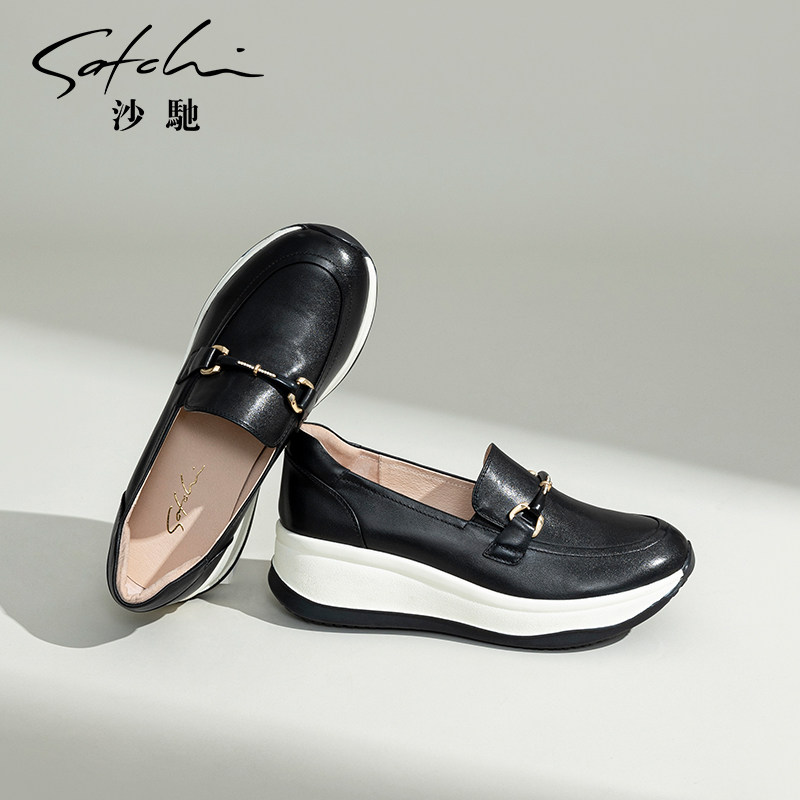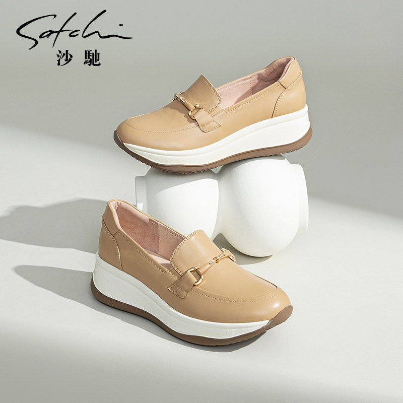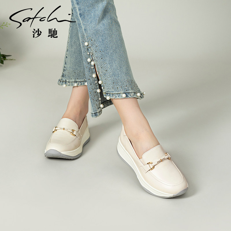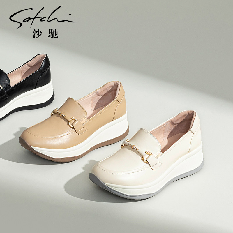 沙驰女鞋牛皮厚底乐福鞋女坡跟2026新款妈妈单鞋春夏季百搭休闲鞋