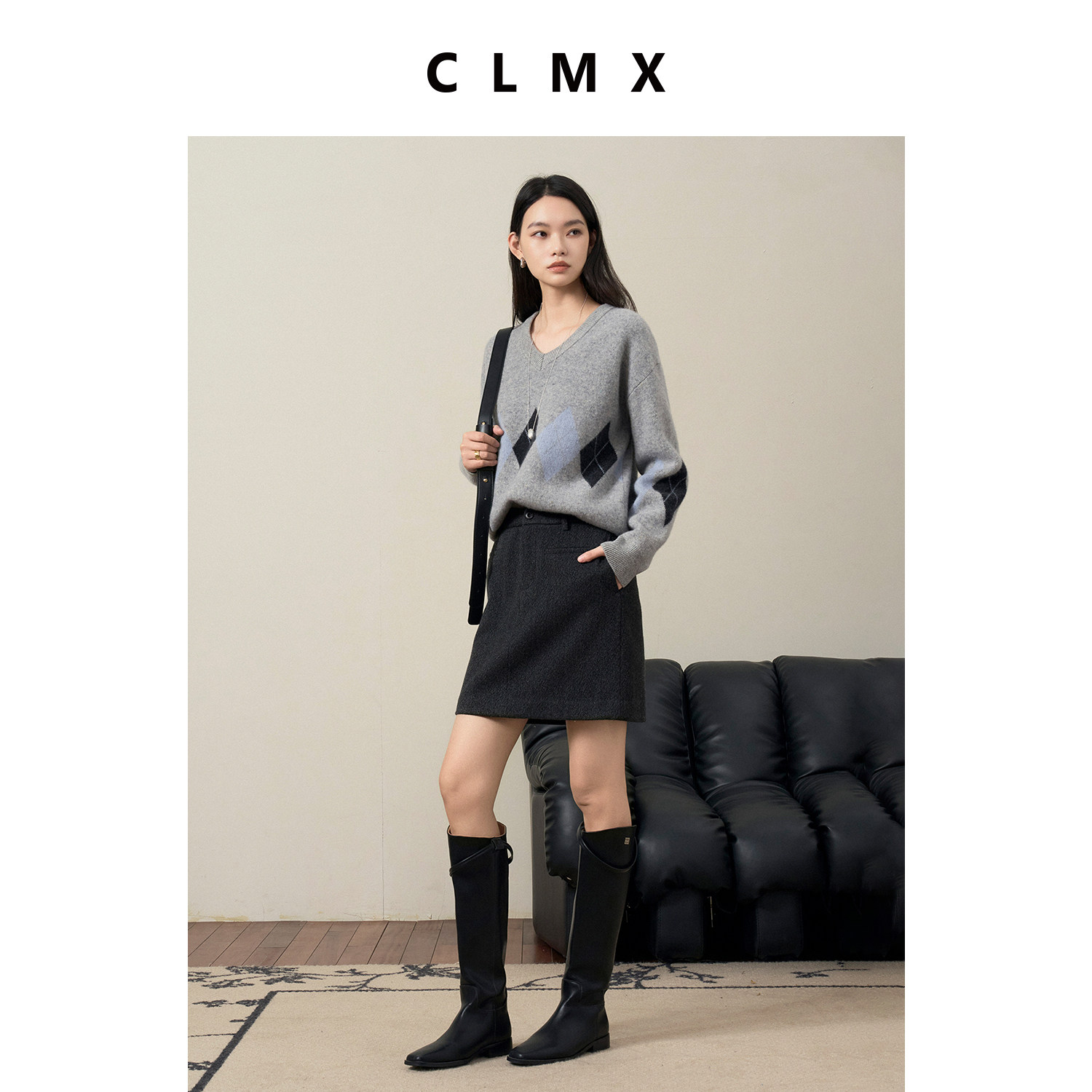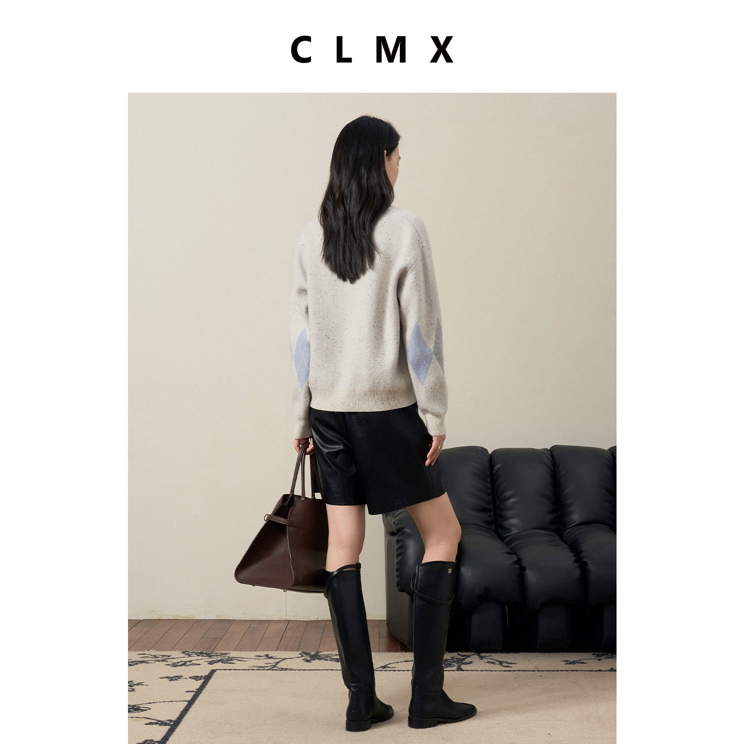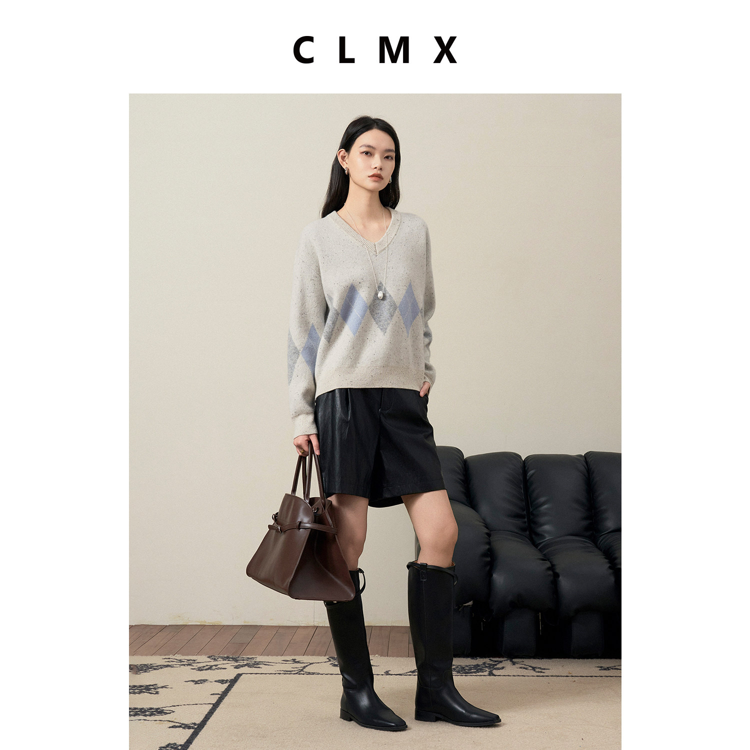 CLMX亲肤保暖有型100%羊毛纱线毛衣复古知识分子风菱格V领针织衫