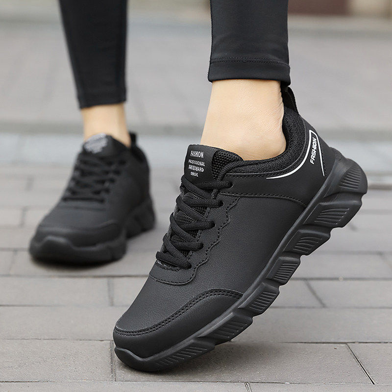 欧伦啄木鸟春季女鞋运动鞋皮面防水轻便跑步鞋黑色软底休闲防滑旅