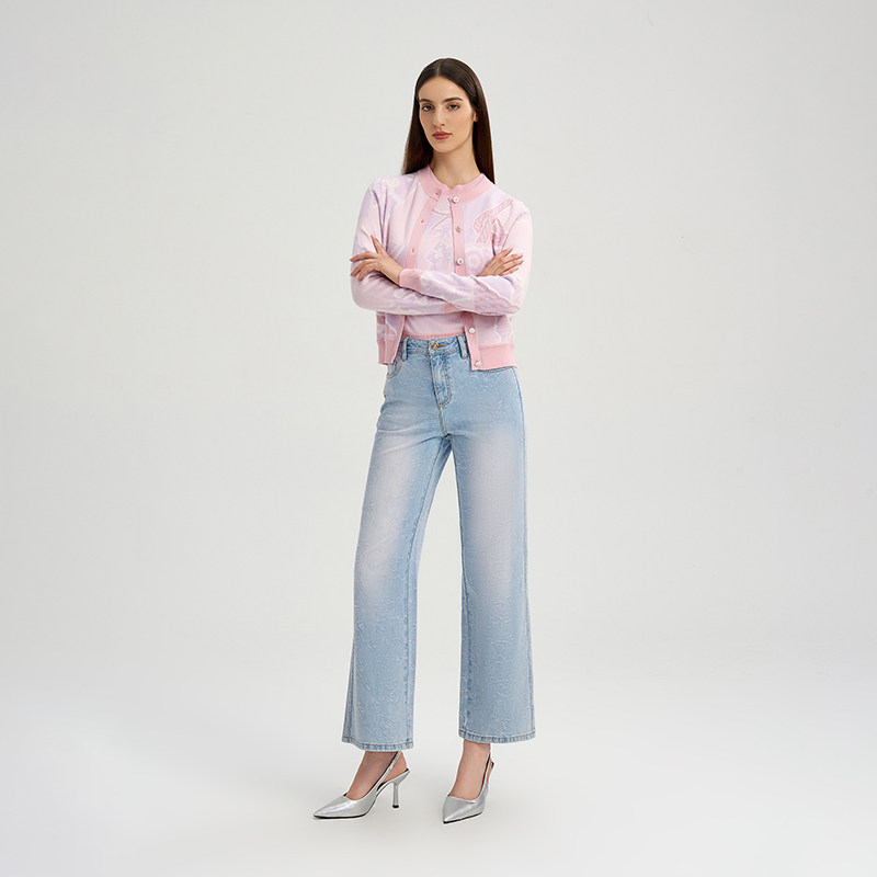 RARE威雅女装2025秋季新款主题花型提花粉紫色长袖毛开衫短袖毛衫