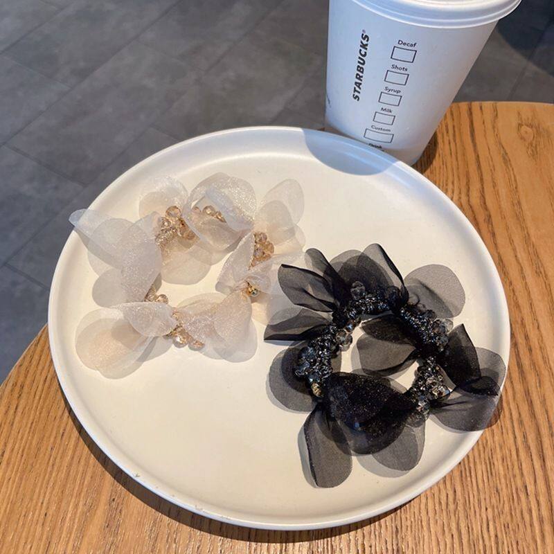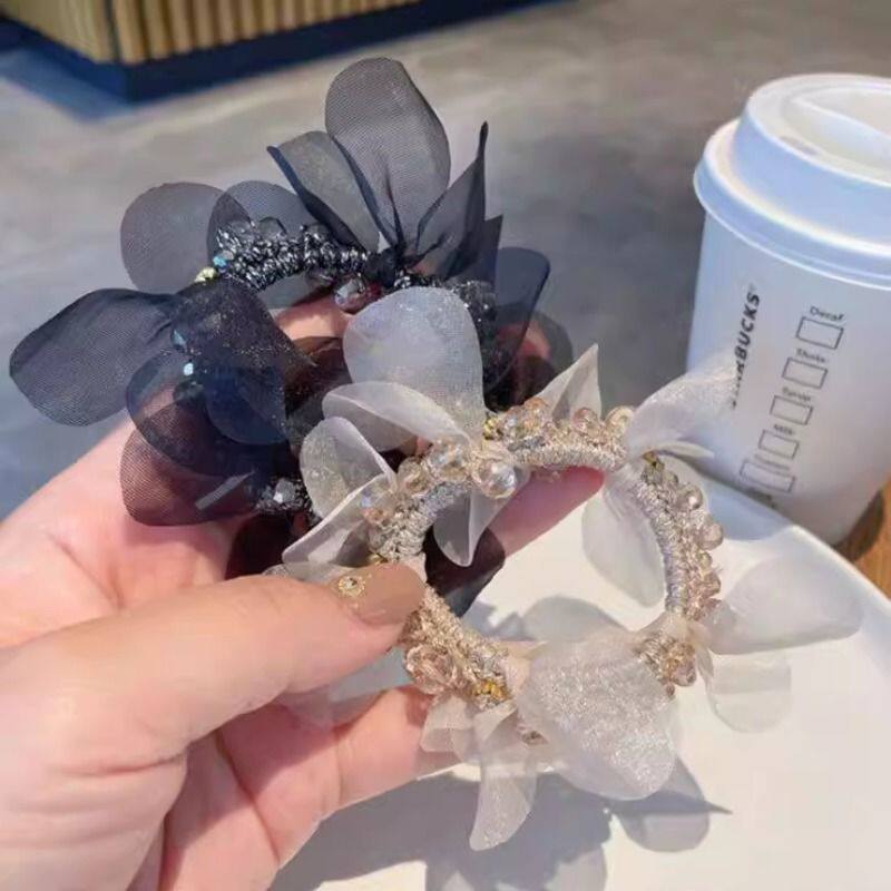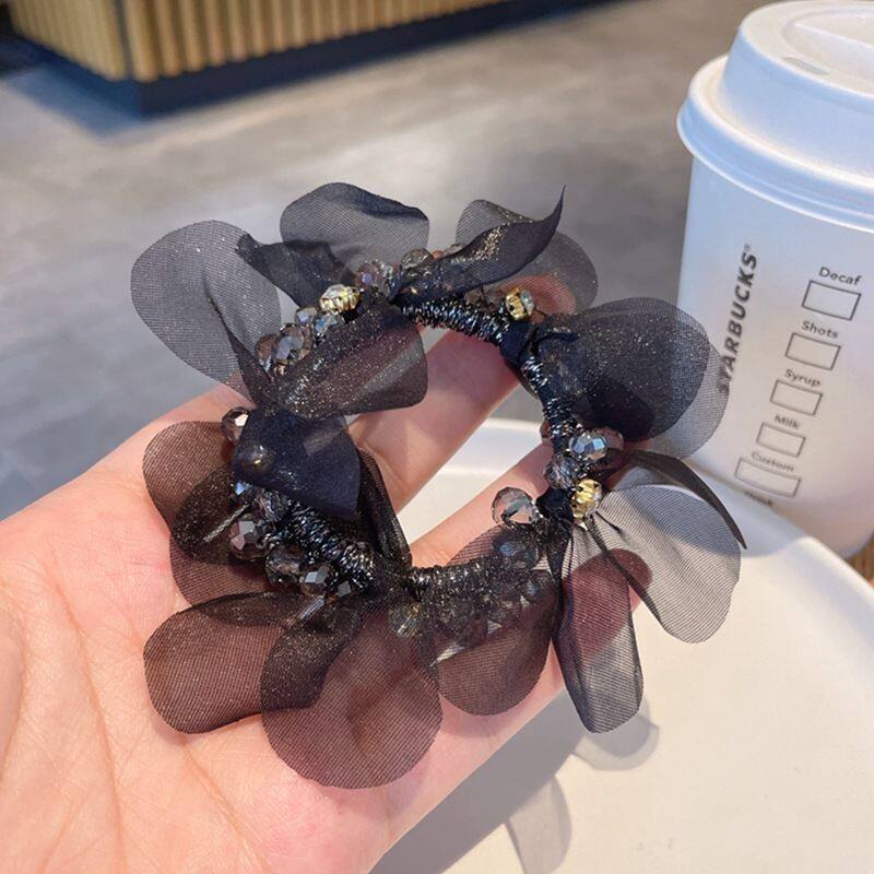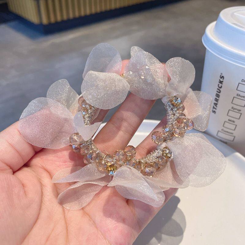 优雅气质花瓣欧根纱水晶发圈精致高马尾丸子头扎头绳女发绳蝴蝶结