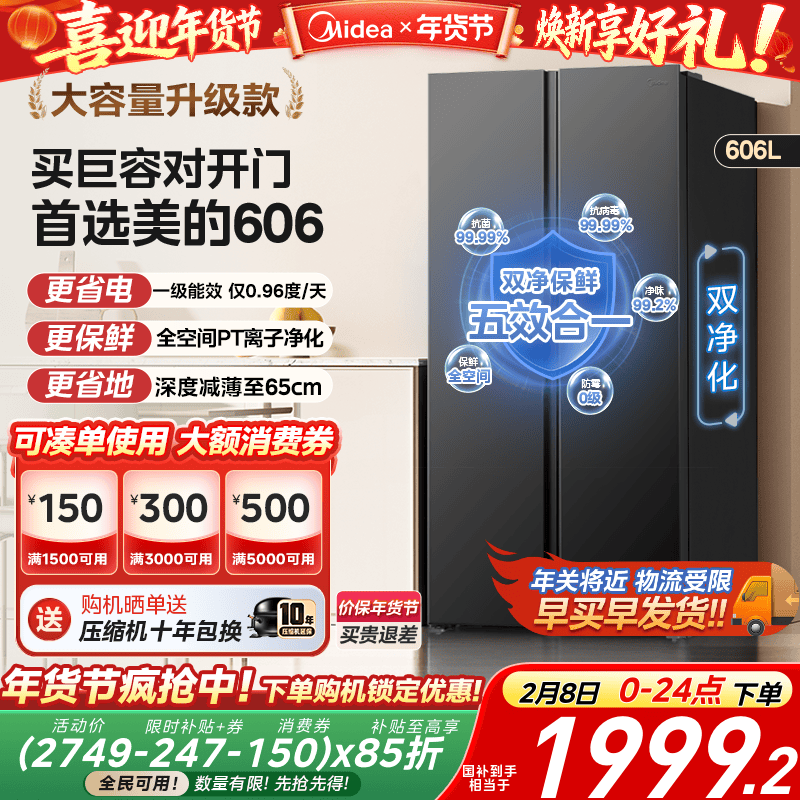 美的606对开双开门大容量超薄风冷无霜一级能效节能家用冰箱