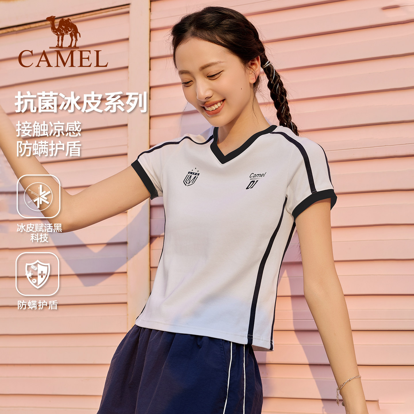 骆驼运动短袖女复古T恤夏冰感抗菌网球羽毛球半袖美式V领正肩上衣