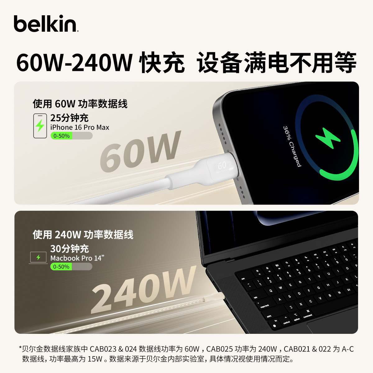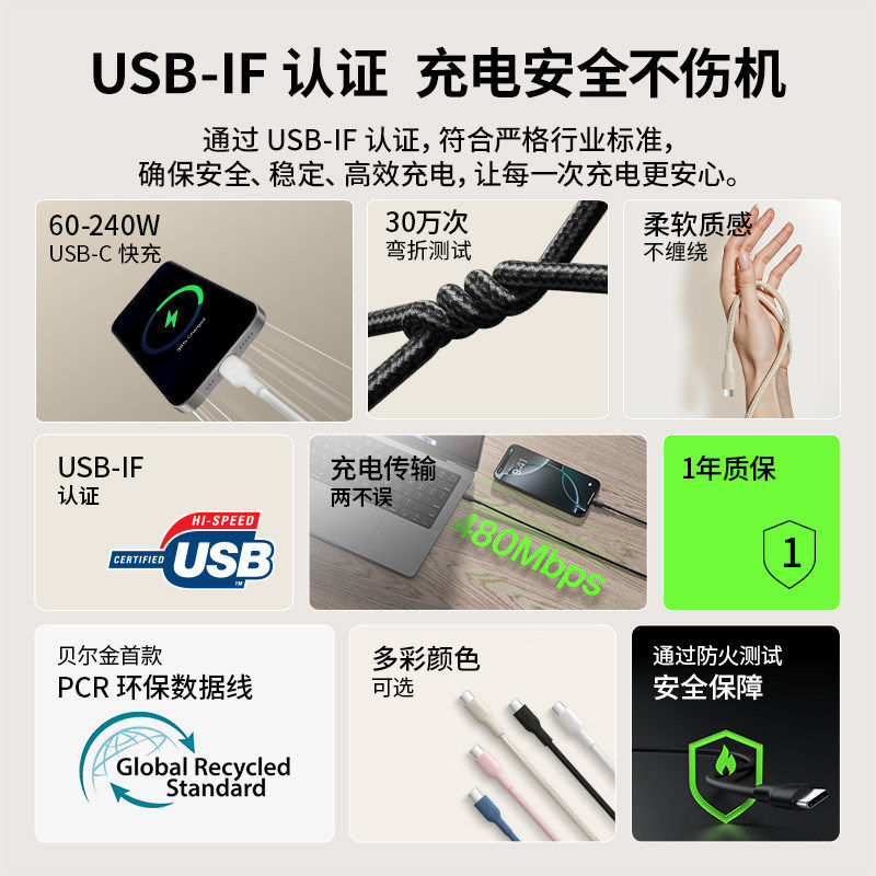 Belkin贝尔金PD快充TypeC充电数据线编织lighting适用苹果16/15充电器线iPhone17ProMax安卓手机iPad平板Air