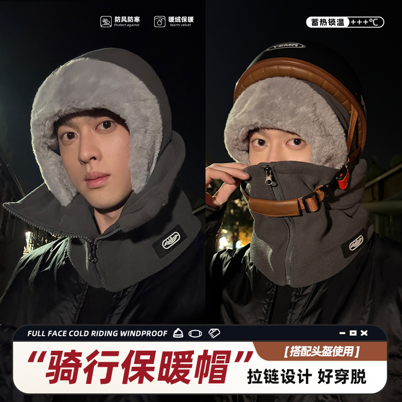 骑行秋冬季防风一体帽子男骑车防寒面罩围脖电动车头盔保暖内胆女