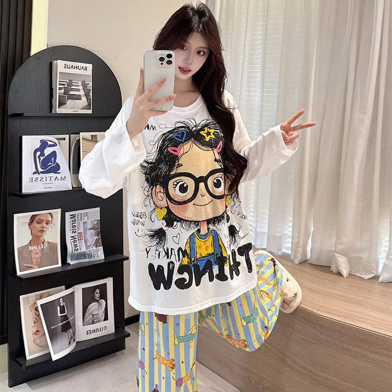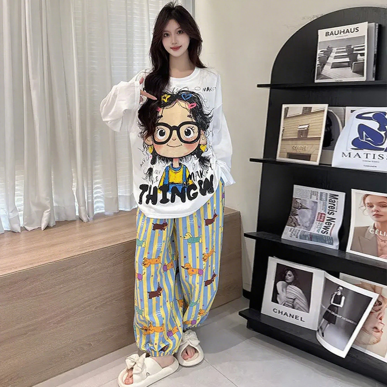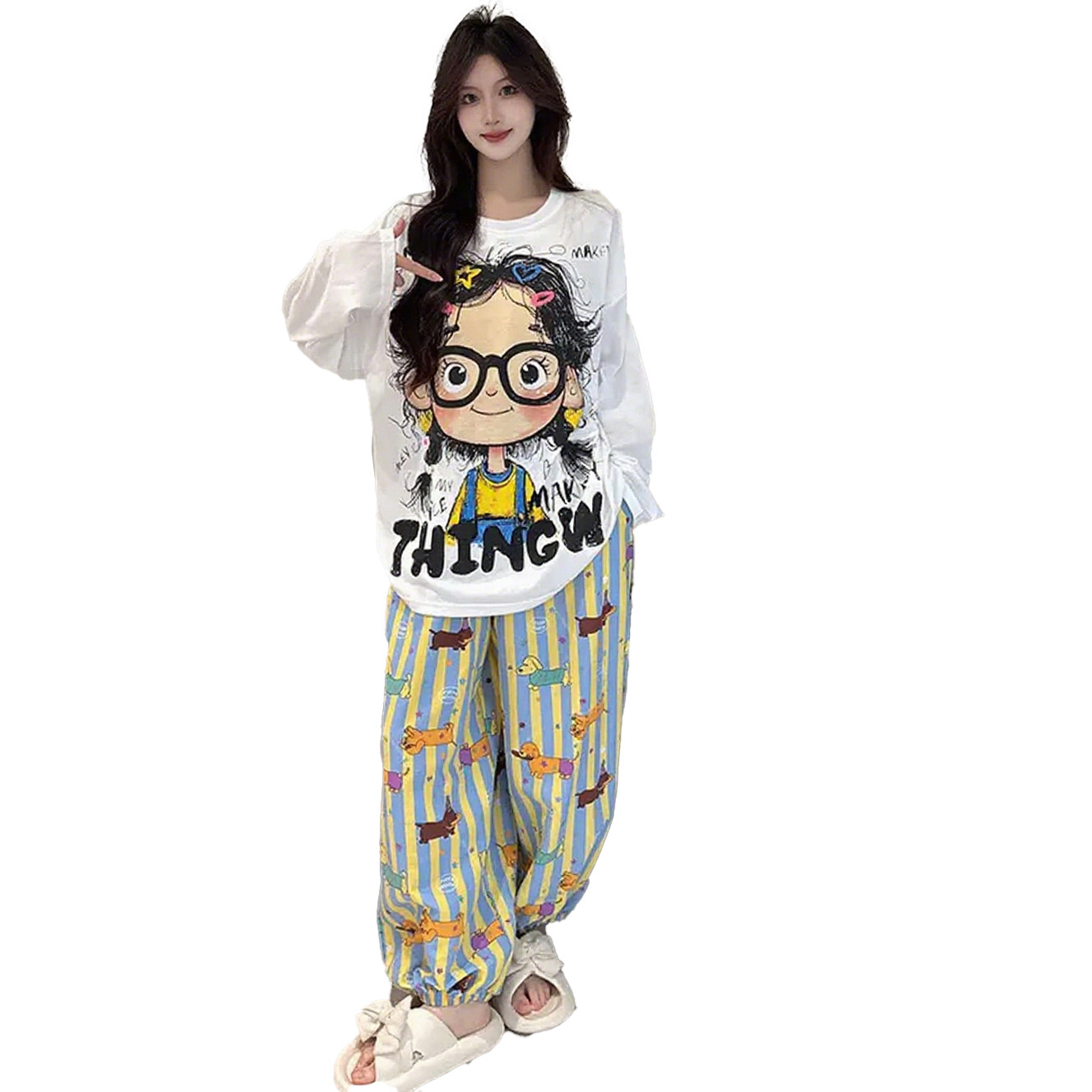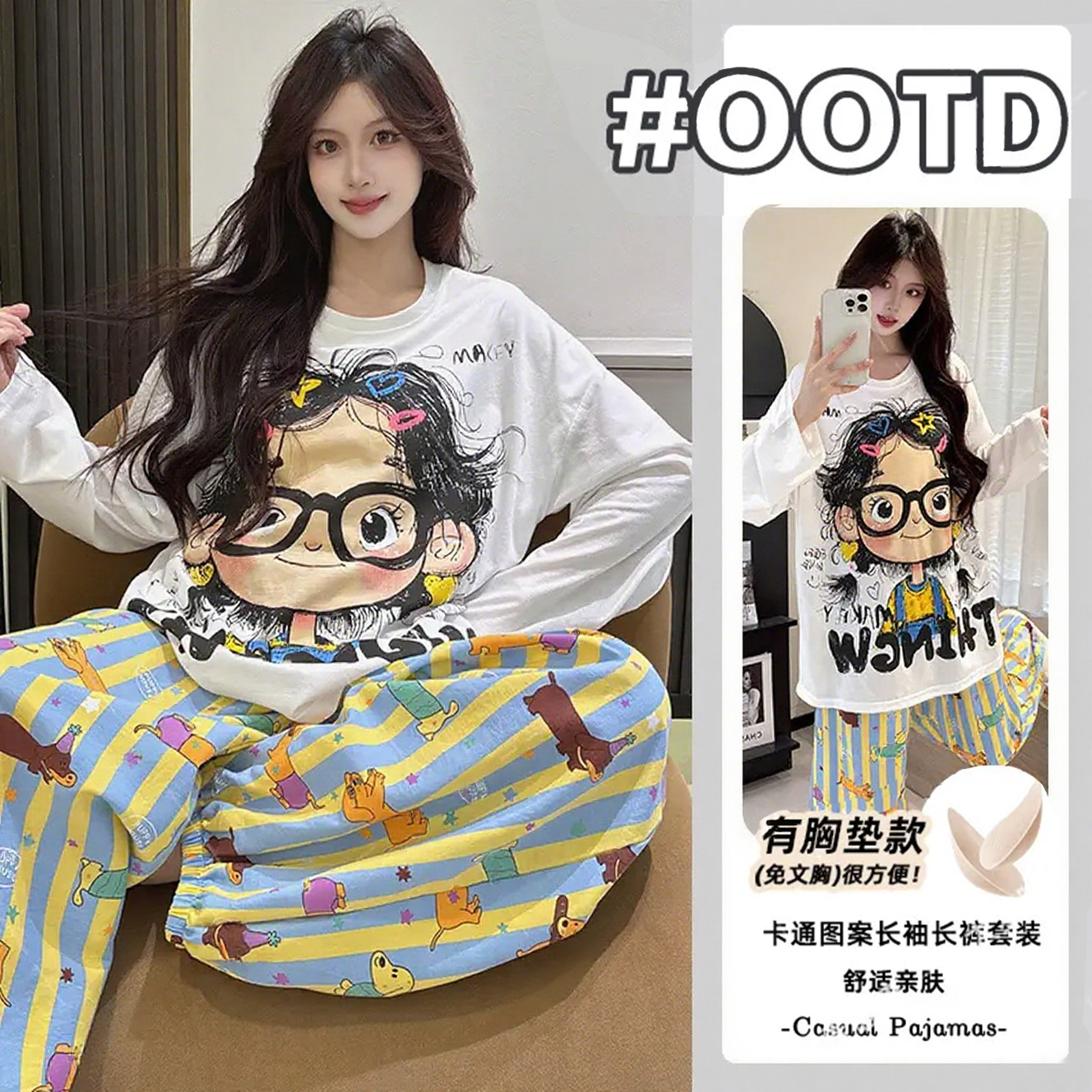 2026新款带胸垫棉绸睡衣女春季可爱卡通卷发女孩长袖家居服可外穿