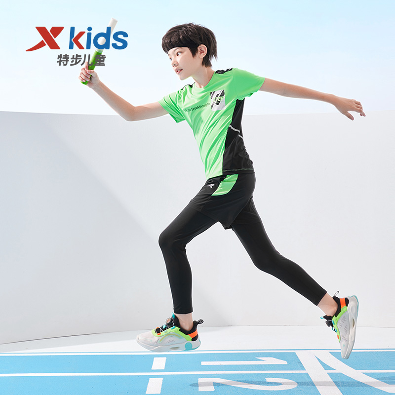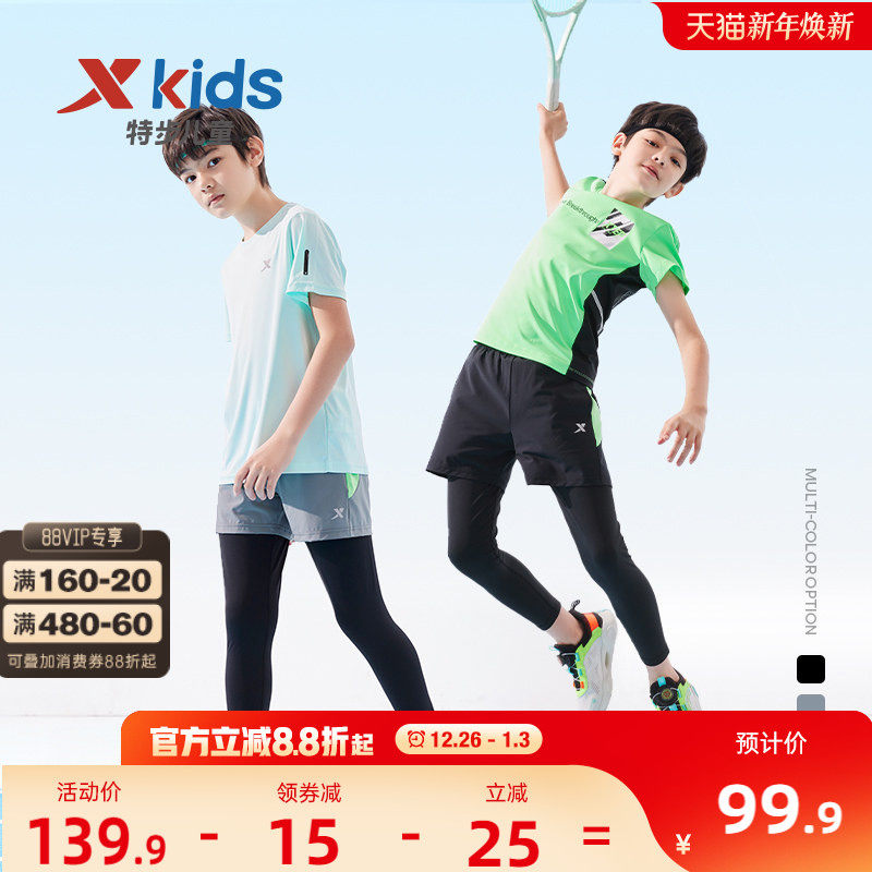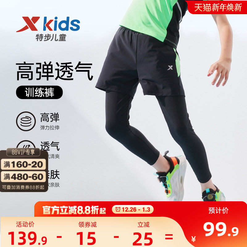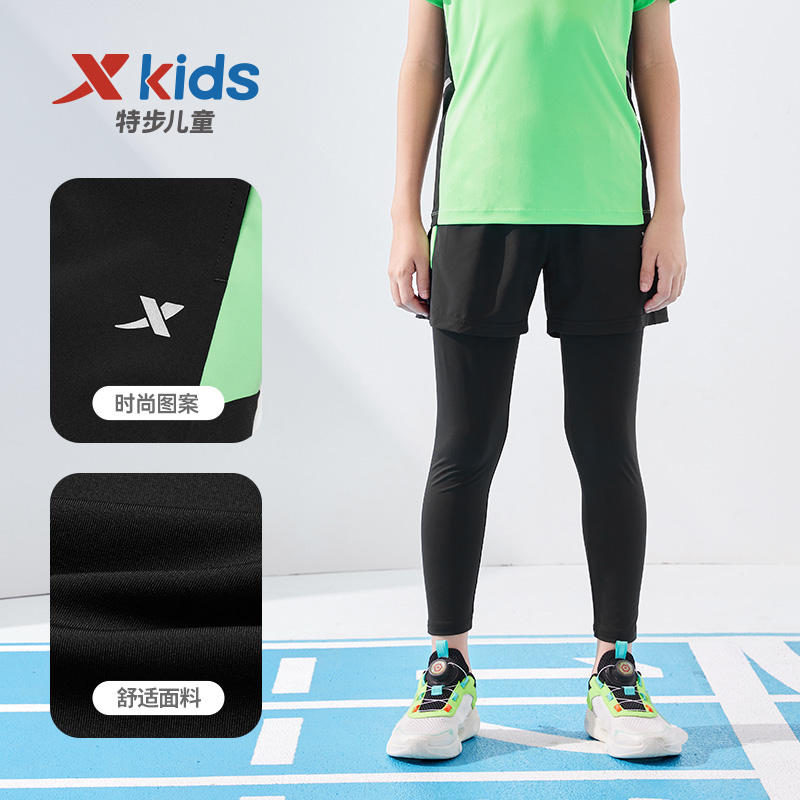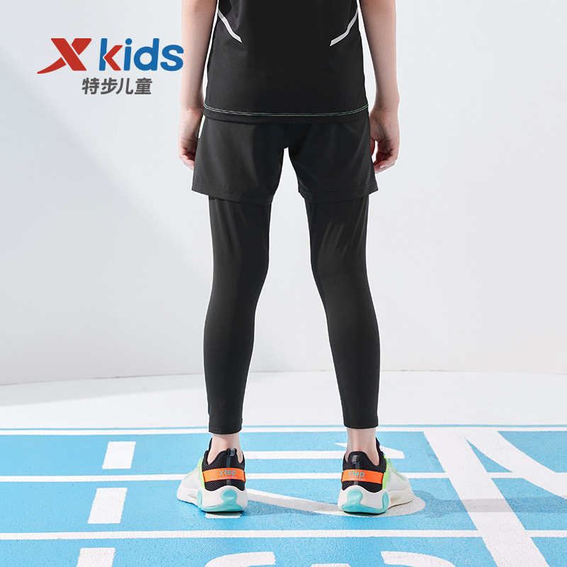 特步男童裤子打底裤秋冬薄款儿童大童假两件运动长裤紧身裤训练服