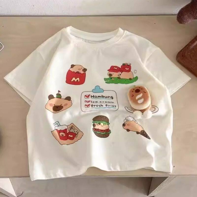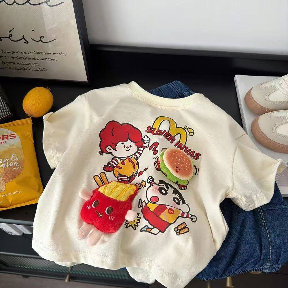 立体玩偶短袖T恤纯棉潮款夏装宽松卡通印花洋气汉堡公仔儿童上衣