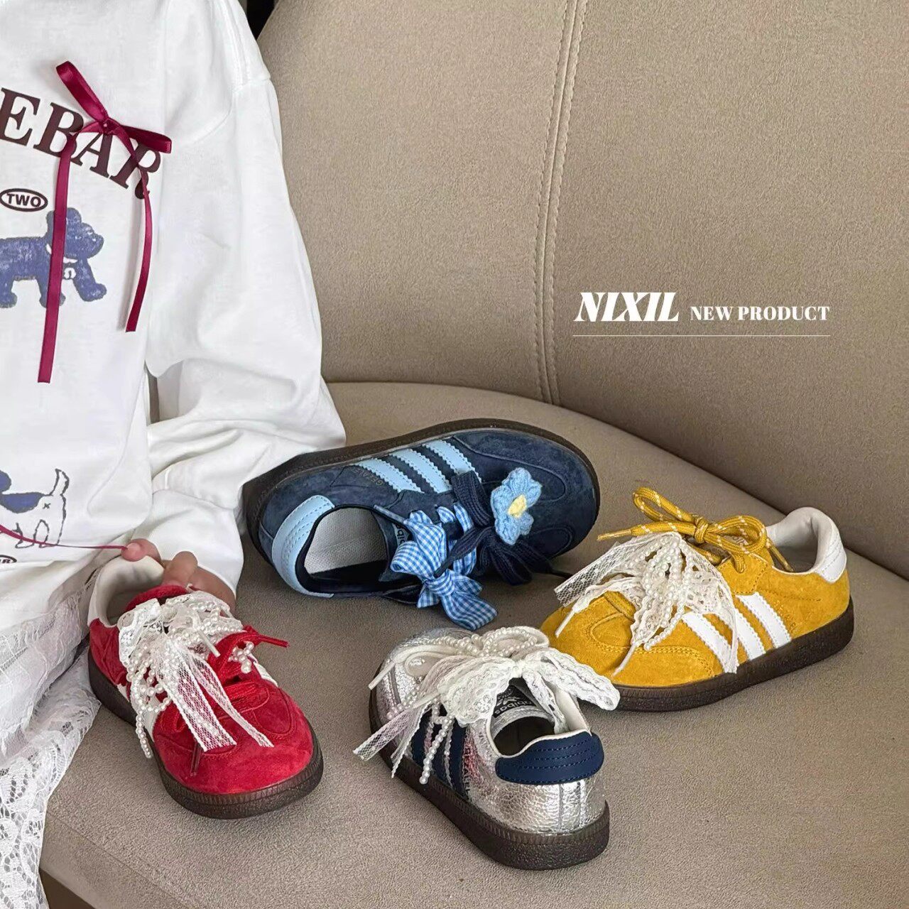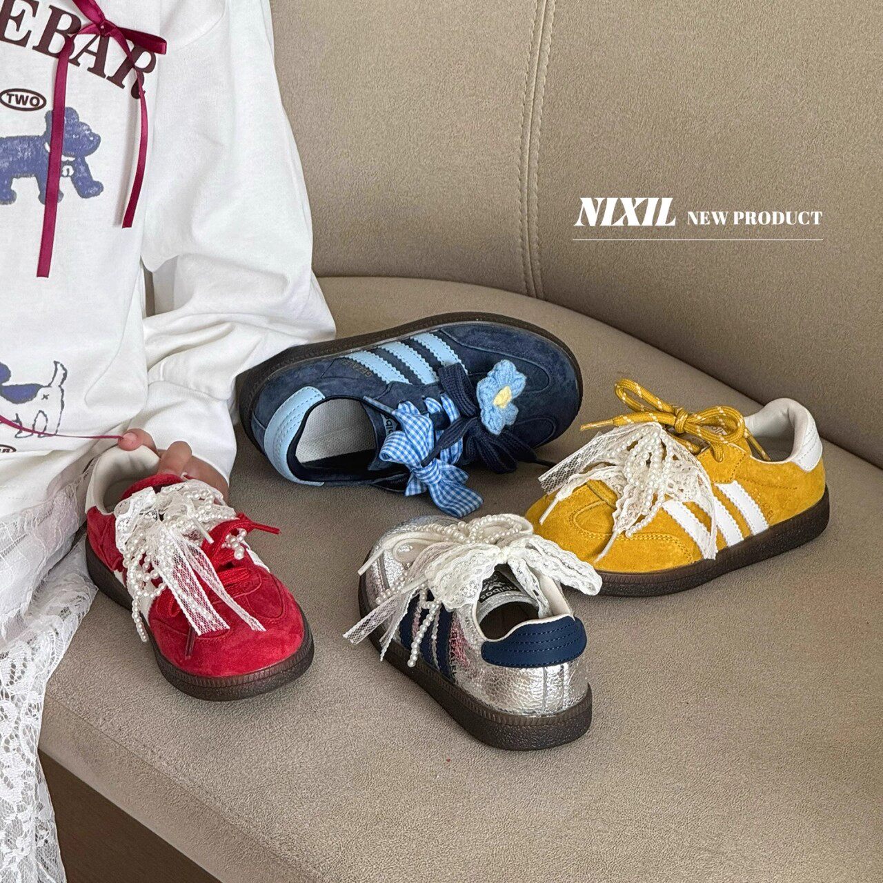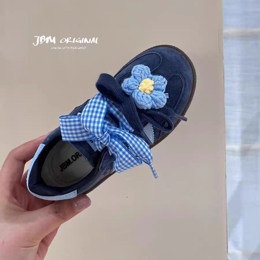 巴布豆真皮女童鞋子2025秋季新款儿童百搭软底防滑蕾丝花朵德训鞋