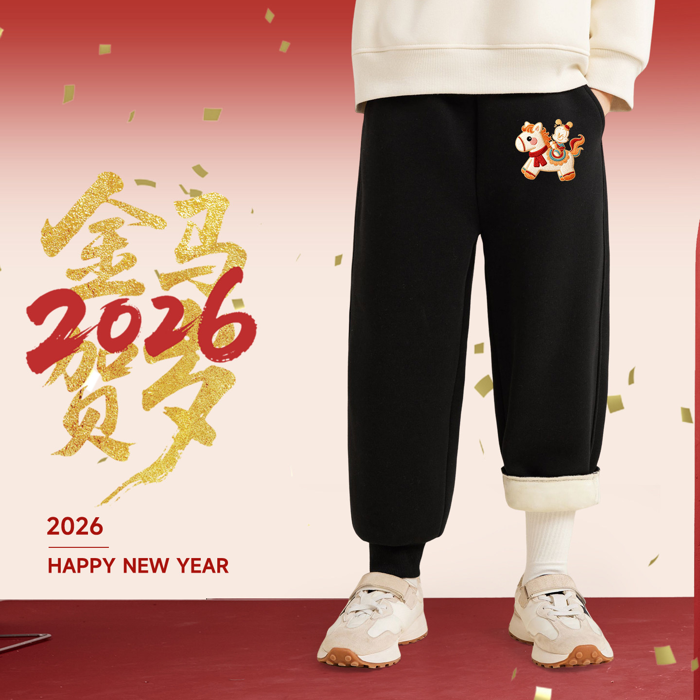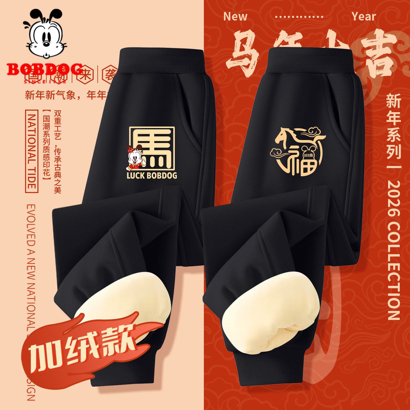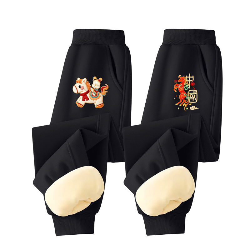 巴布豆儿童加绒新年长裤男童加厚一体绒休闲裤2026保暖裤子冬马年