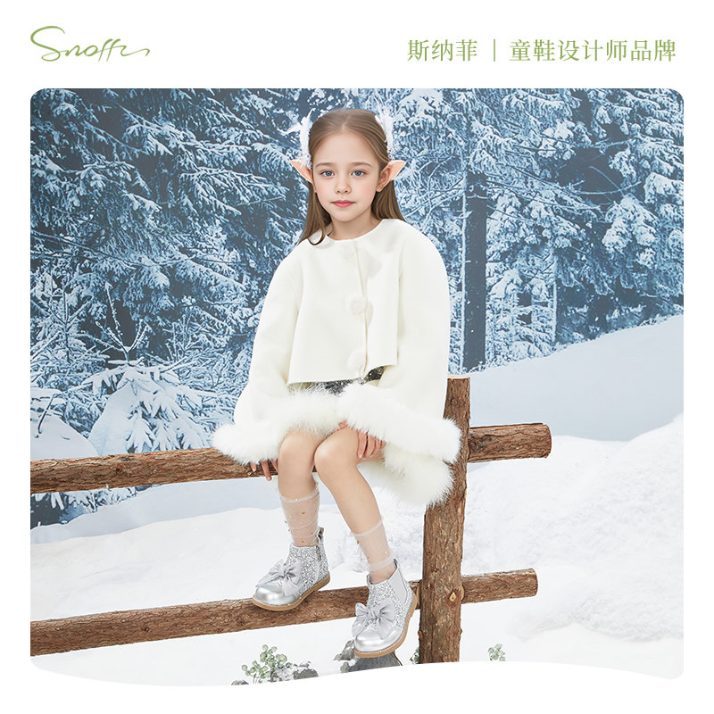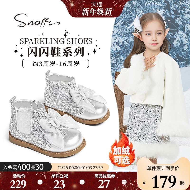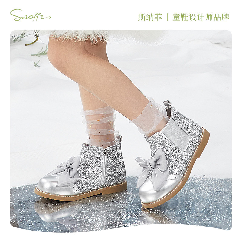 斯纳菲女童靴子2025秋冬新款皮靴洋气水晶靴软底防滑加绒保暖短靴