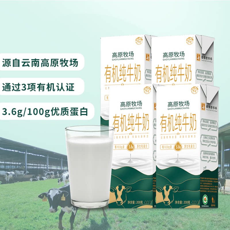 乍甸云南高原牧场有机纯牛奶200g*4盒整箱学生营养早餐奶3.6蛋白