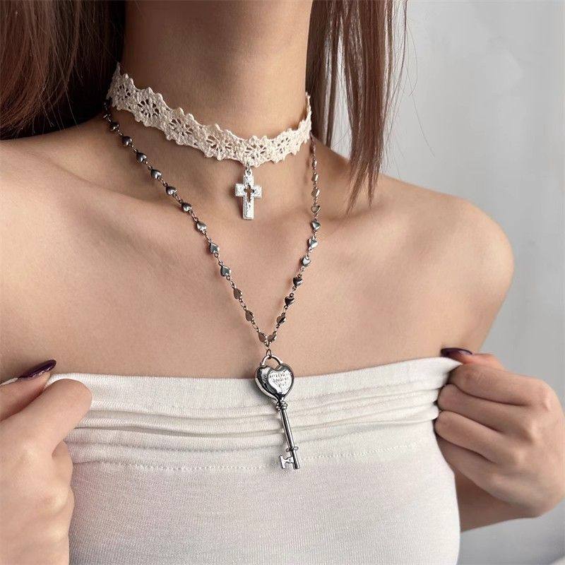 白色蕾丝十字架choker叠戴爱心项链女小众颈链吊坠多层钥匙甜酷