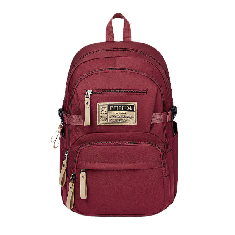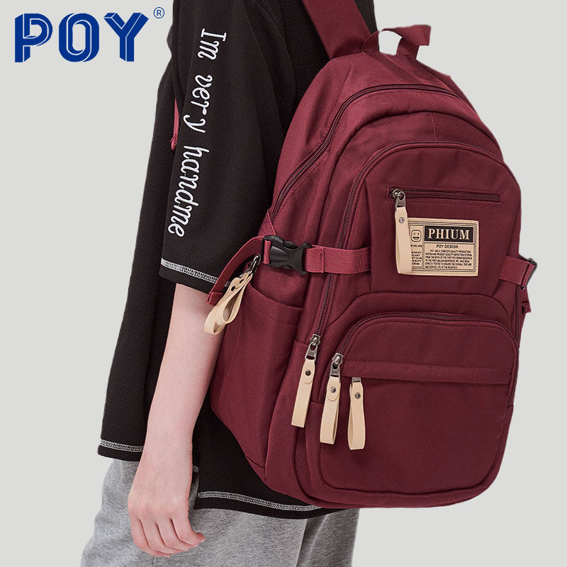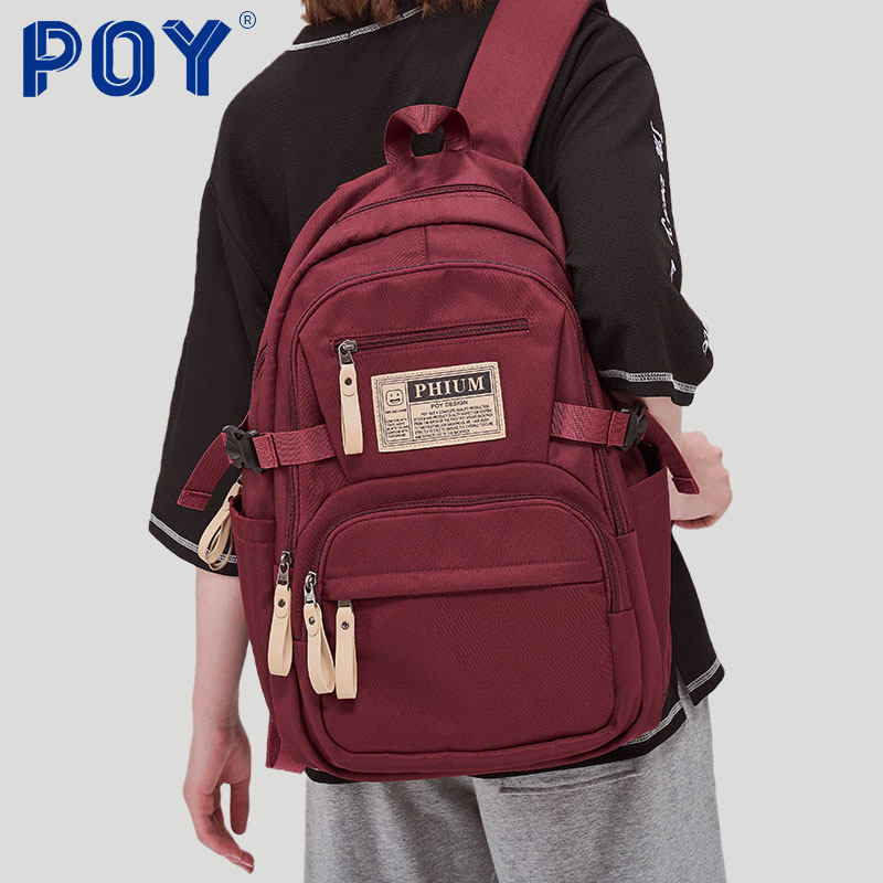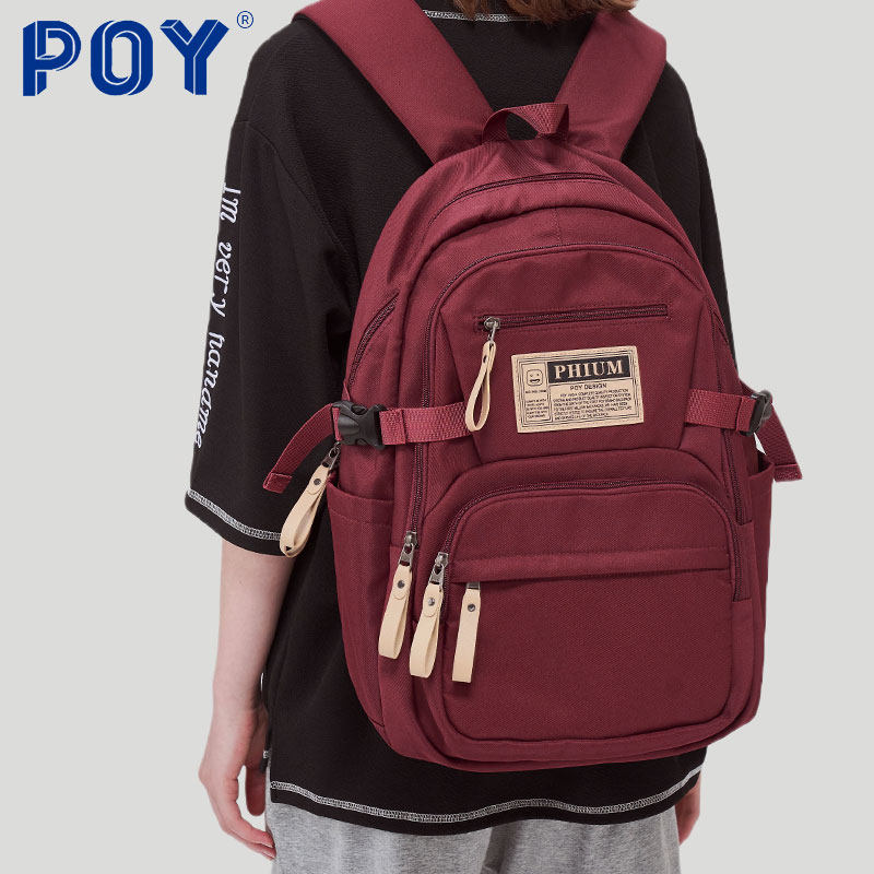Poy®大容量书包女大学生背包男酒红色女生高中初中生中学生双肩包
