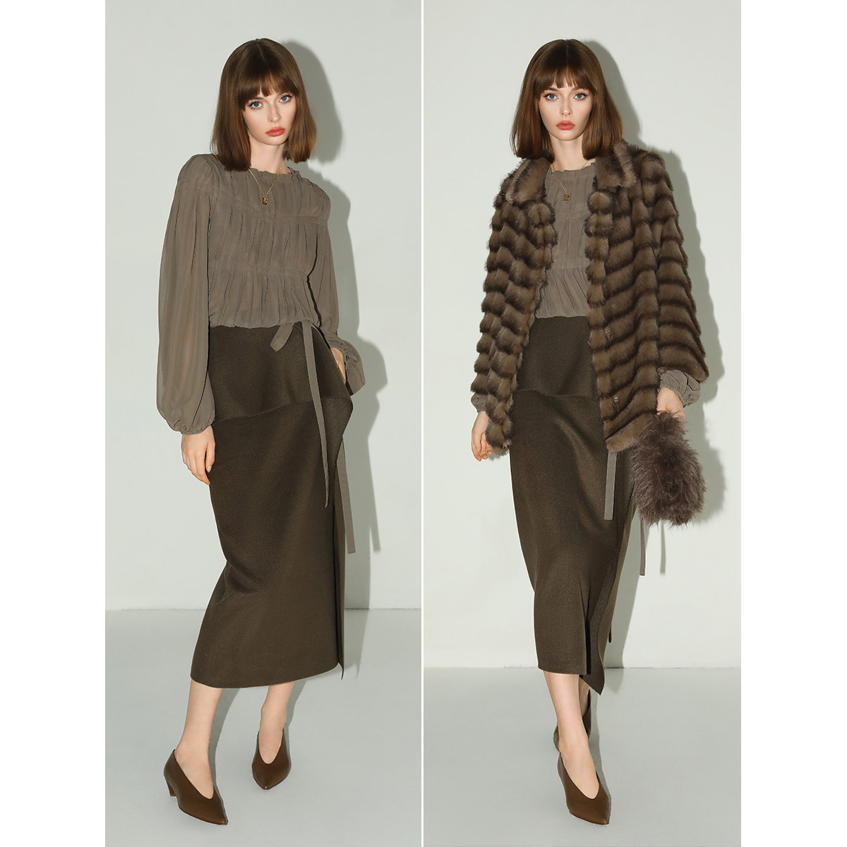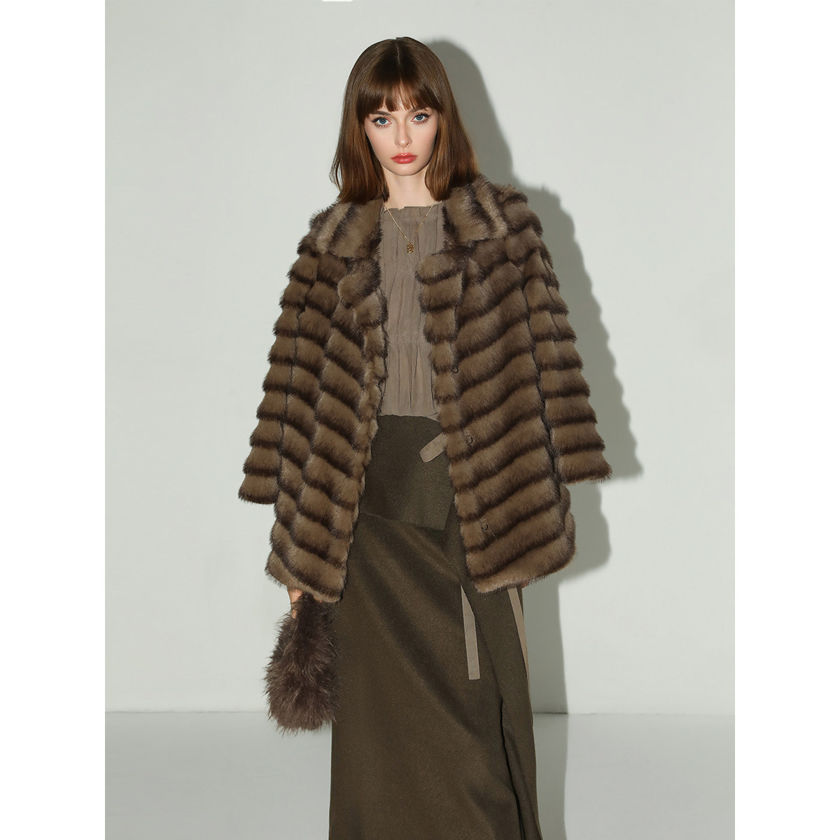 COCOBELLA孟买棕绿高智感荷叶边半身裙通勤毛呢长裙HS3091-2