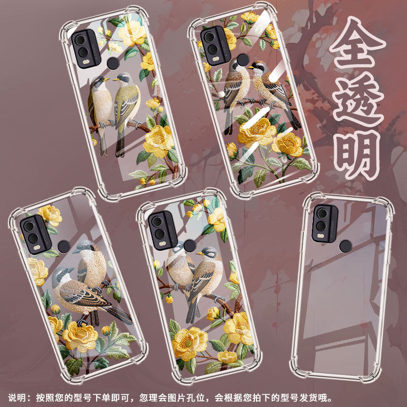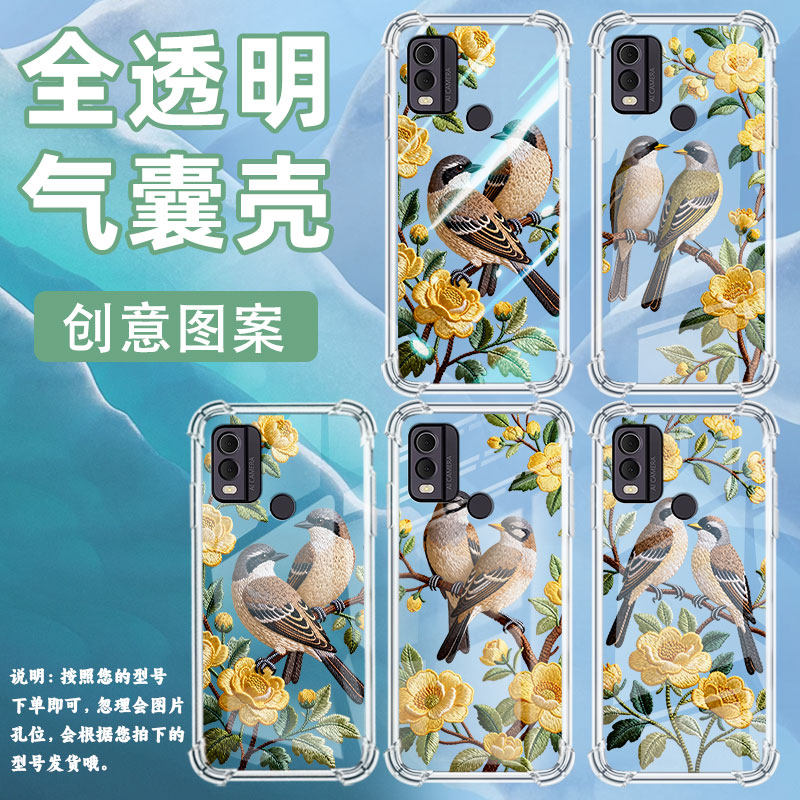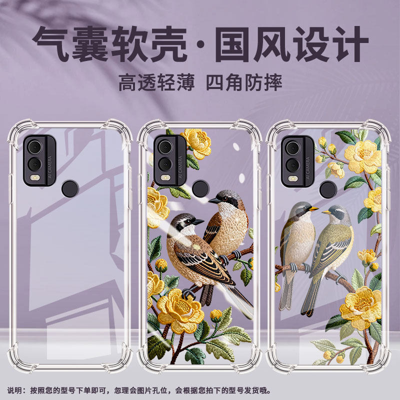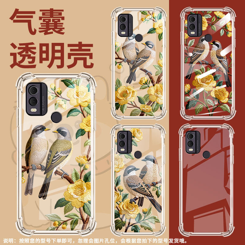 适用诺基亚C200气囊壳诺基亚C21+男女款诺基亚C21手机壳刺绣花鸟NokiaC22四角防摔TA-1424全包边保护套