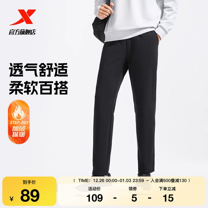 特步加绒卫裤男士加厚秋冬款裤子针织保暖裤直筒裤子休闲运动裤