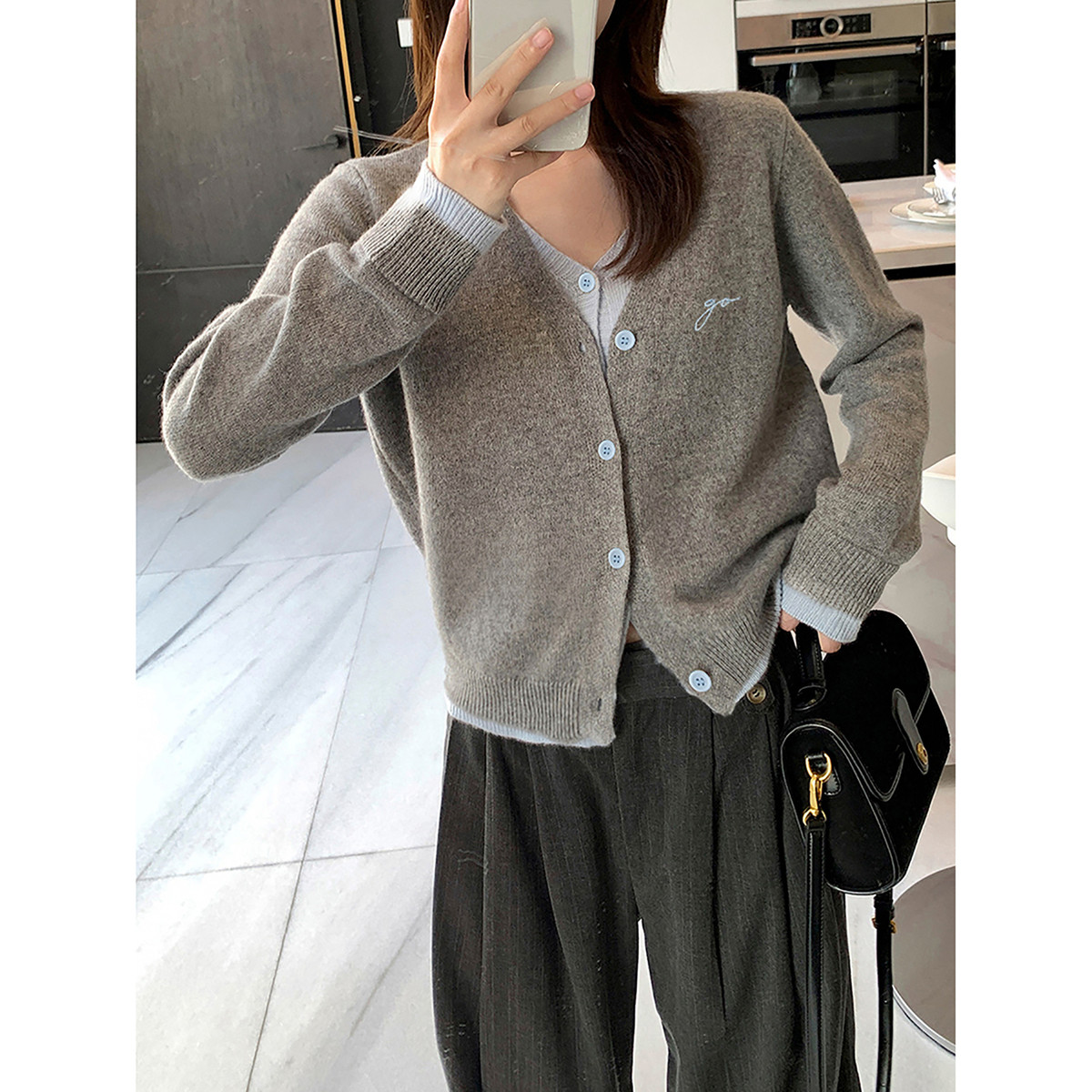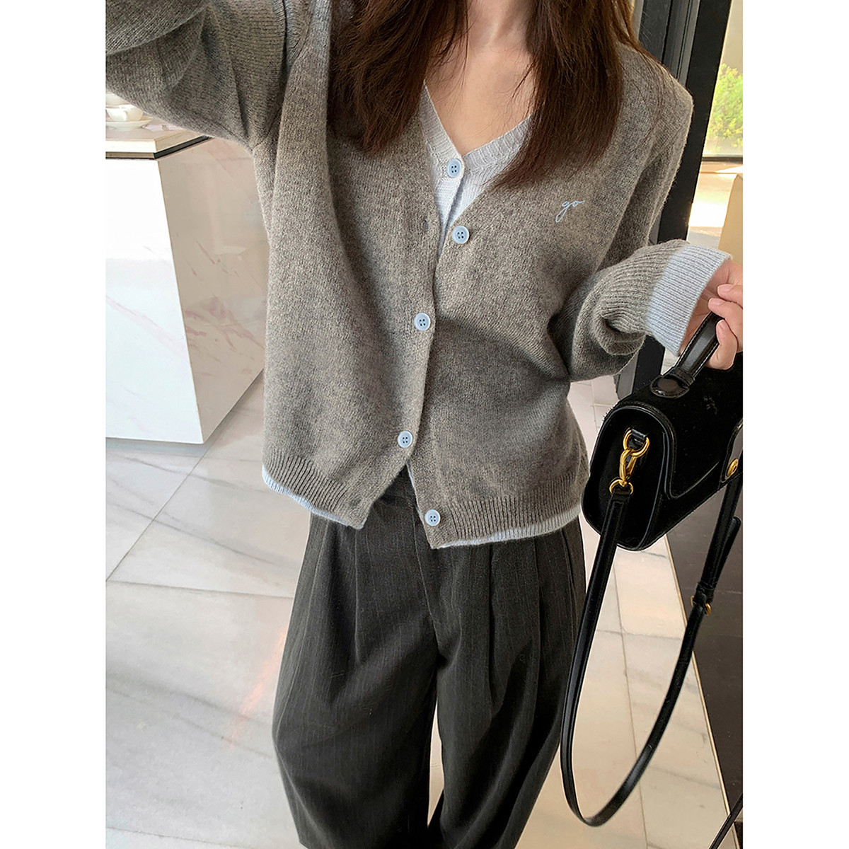 唐狮秋冬毛衣女简约显瘦V领假两件针织外套高级感韩系早秋TD