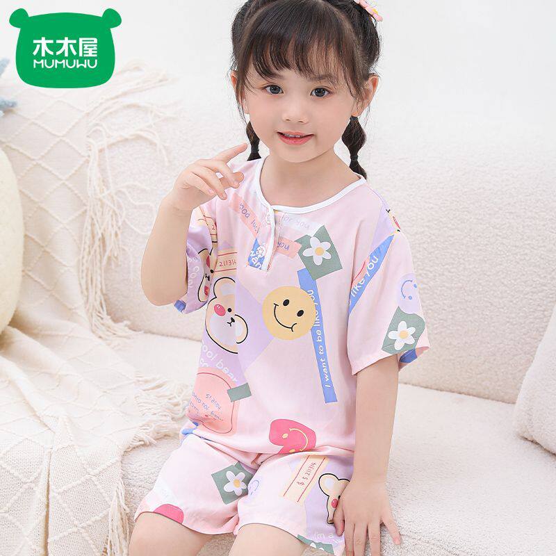 木木屋夏季短袖短裤儿童睡衣套装棉绸男女童小孩子薄款家居服套装